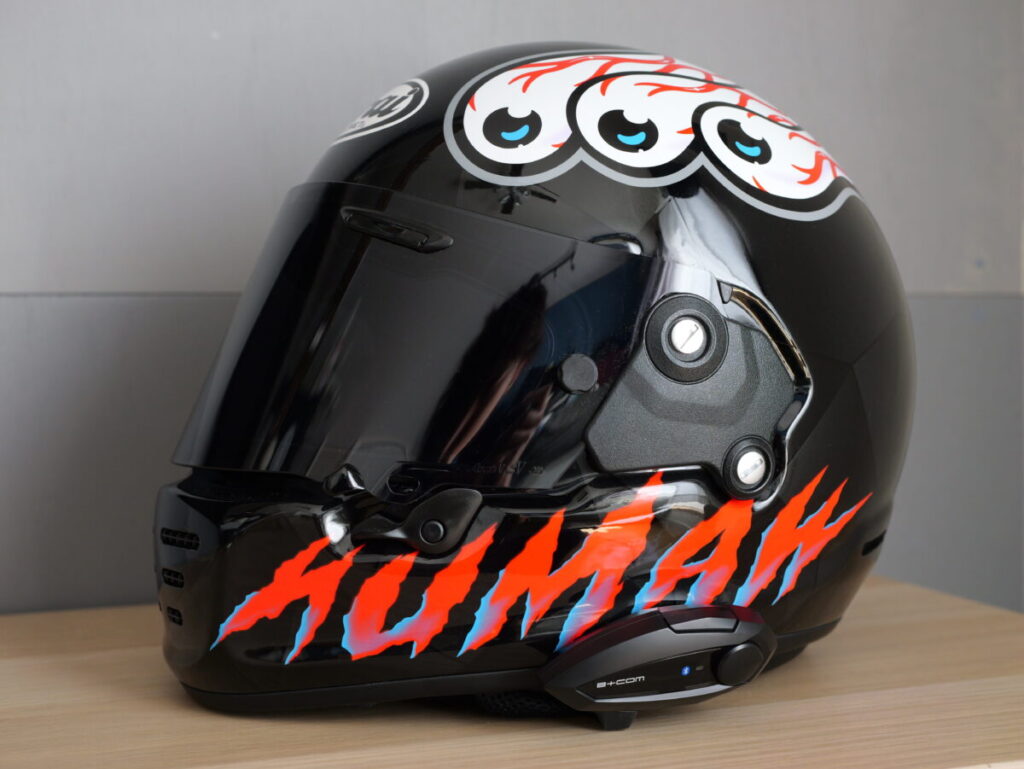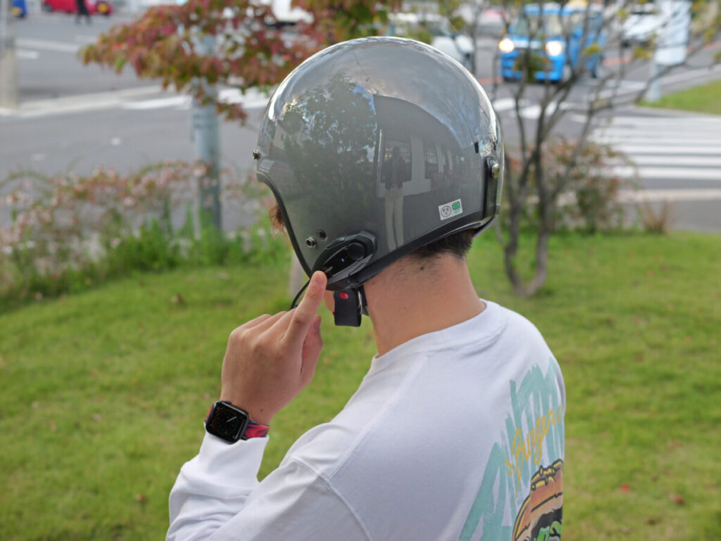 今回はソリッドカラーのモデルとグラフィックモデルのヘルメットに取り付けてみたのだが、どんなヘルメットにもインカムが主張しすぎずに馴染んでくれそうなので、おしゃれなオープンフェイスからフルフェイスタイプ、オフロードやツアラーモデルまで対応できる。