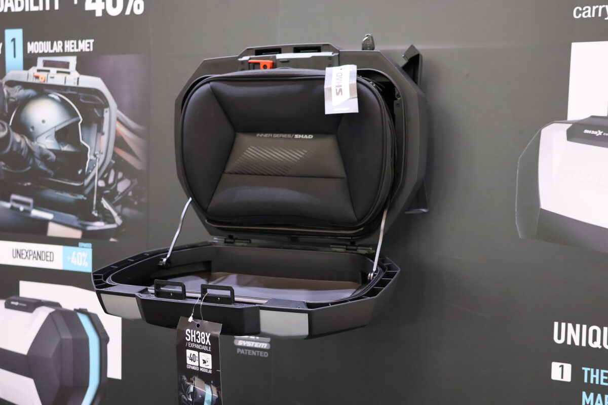 「SH38X サイドケース」は、既に展開しているトップケース「SH58X/SH59X」と同様の「拡張機能」を有するバイク用サイドケース。テンションケーブルシステムを内部に搭載し、まるで望遠鏡のように均一かつ自在に動かせる構造で、収縮時よりプラス40%の拡張が可能となっている。