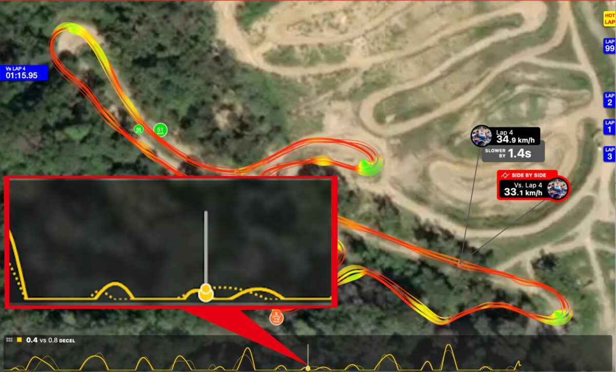 LITProというアプリを使って愛知県のモトクロスコーススラムパークでの走行データを可視化してみると、その違いは一目瞭然です。上のグラフの太線が純正ブレーキパッド、点線がジグラムパッド ダートシンタードでの走行データです。GPSと加速度センサーで測っているため、グラフ上は減速度として表示されています。