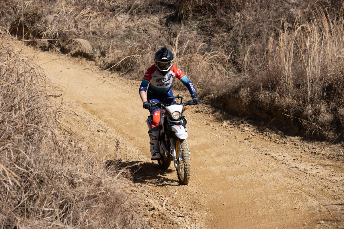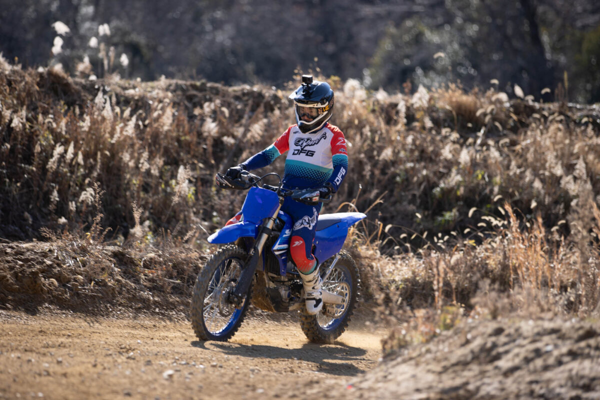 スラムパークを走行してみると、YZ250FXに比べて制動力の弱さが顕著に感じられました。特に、1本指でブレーキングをする際には、かなりの力を人差し指にかけなければならず、スロットルの操作に集中しづらいような場面もありました。