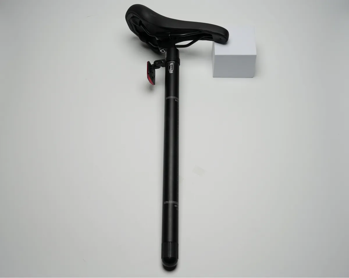 ちなみに場所は一見何の変哲もないシートポストで…シートポストをスポッと抜いてから〜の、先っちょの蓋を開けてから〜の、中から空気入れがこんにちわぁ♪っと出てくるので…あとはそのままタイヤに空気を注入できる実に画期的な仕様となっております!