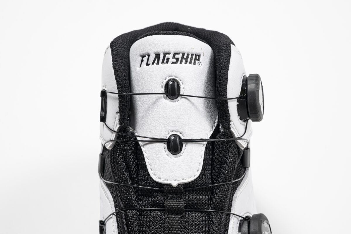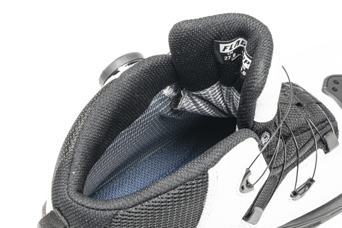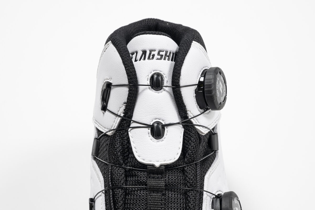 きつめに締めこんだ状態が左端の写真で、右端はテンションがかかるぎりぎりまでゆるくしめつけた状態です。甲と足首の2か所にSPIN-ONシステムを搭載しているので、足の形や足首のフィット感の好みに合わせて調整できます。