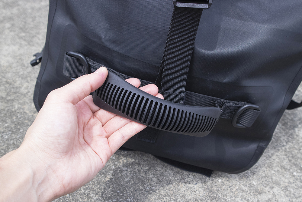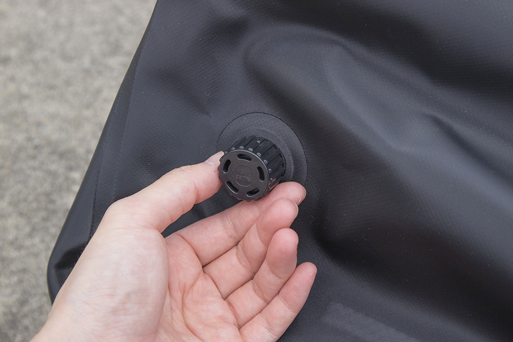 だけど、防水性能の高いバッグだと、バッグの開口部を止める際に空気も一緒にため込んでしまいパンパンに膨れてしまうことありませんか? 小さなバッグならさほど気にならなくても、容量の大きなバッグになればなるほど、空気をため込んでしまう問題は顕著に……。そんな問題を解決してくれるのが、内部の気圧の調節ができる「エアリリースバルブ」なんです。使い方は、バルブをネジを回すように反時計回りに回すとバルブが緩んで空気が抜けます。あとはバッグを押して空気を抜いたら、バルブを時計回りにまわしてロックするだけ! これでバッグ本体の大きさを最小限にすることができるのでとても便利です。