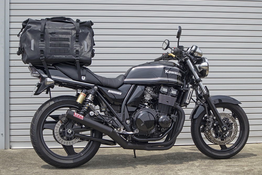 そして筆者のカワサキZRX400-2にも取り付けてみました。バイクのカラーもブラックなので、相性もばつぐん! 大容量サイズなので、もちろんバッグの存在感はありますが、悪目立ちしないという点ではかなり満足です。取り付けたあと開口一番に「えっ!めっちゃいいじゃん!」と思わず声に出ちゃいました(笑)。