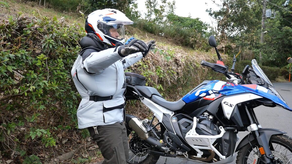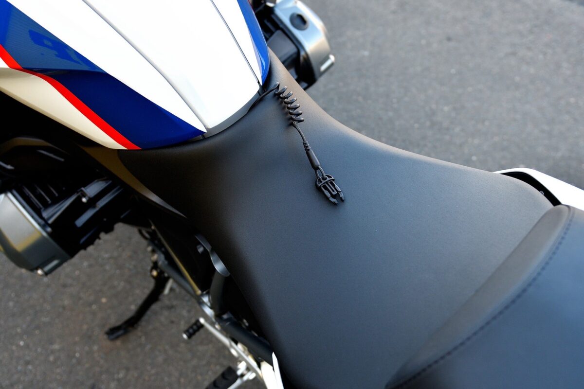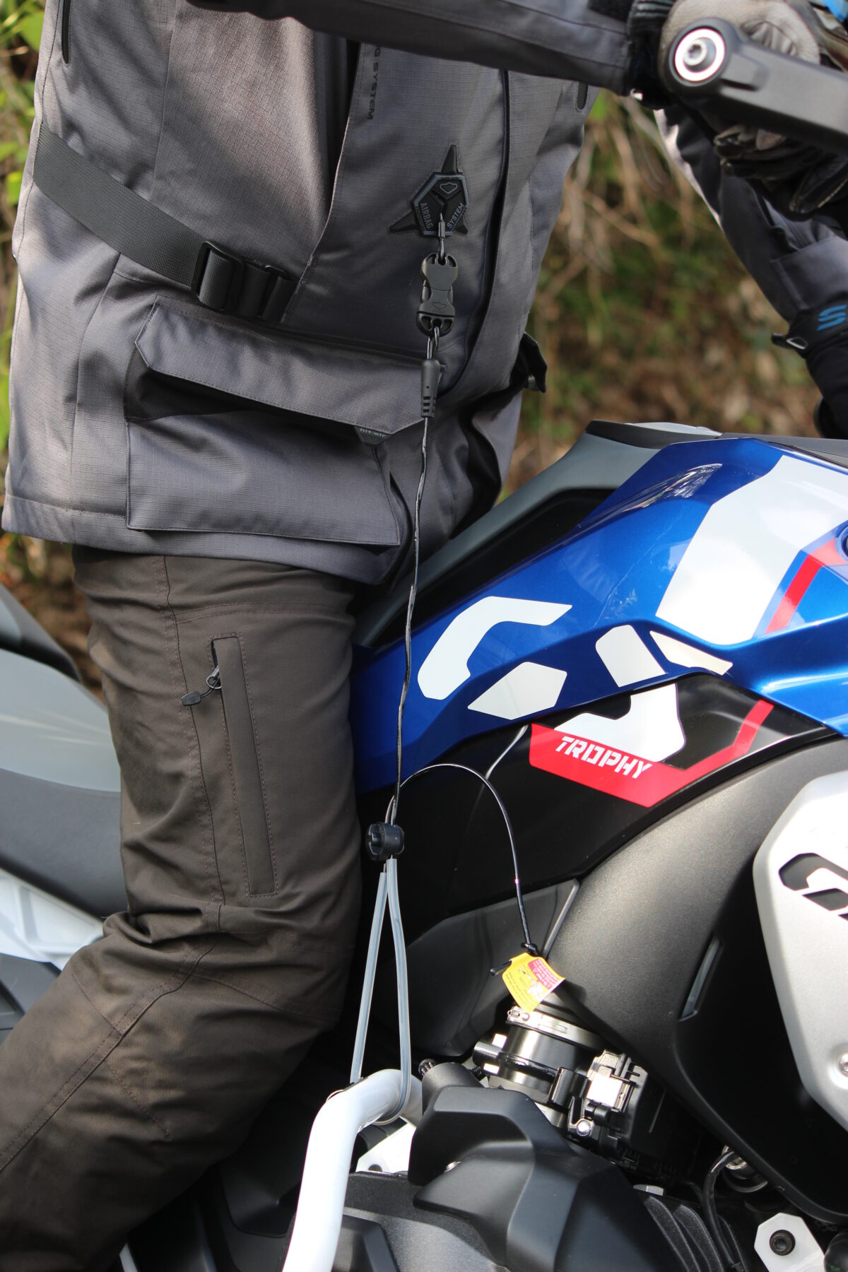 今回はメーカーに許可を得て、実際にエアバッグを体験できることとなった。キーボックスから出たワイヤーをR1300GSのエンジンガードに固定して、ライダーが降りた状態で一気にキーボールを抜く。