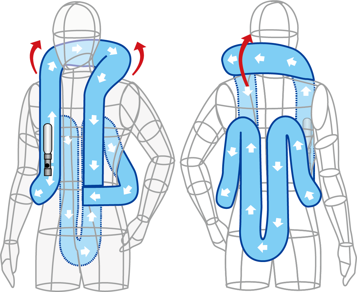 このEU-7が搭載しているのは首気室露出型(キーボックス背面気室+尻気室収納型)キーボックスB型という種類のエアバッグで、起動すると瞬時に首、鎖骨、脇腹、背中、腰、尻という広範囲がエアバッグで包まれる。