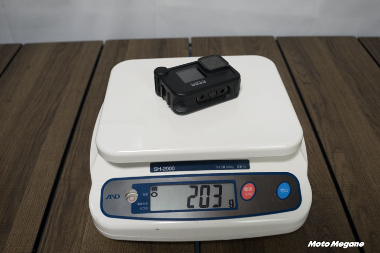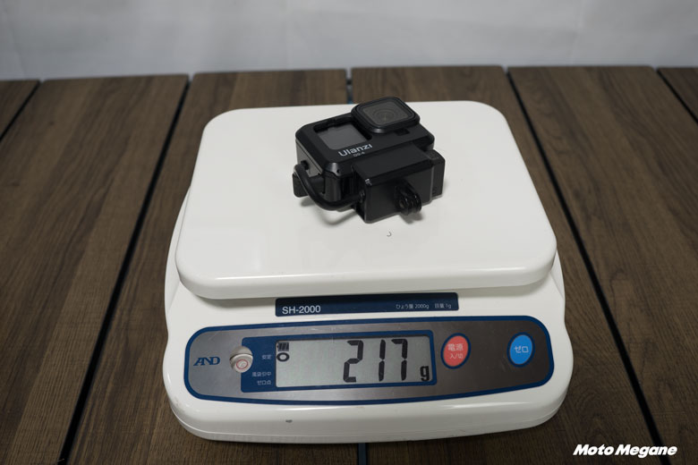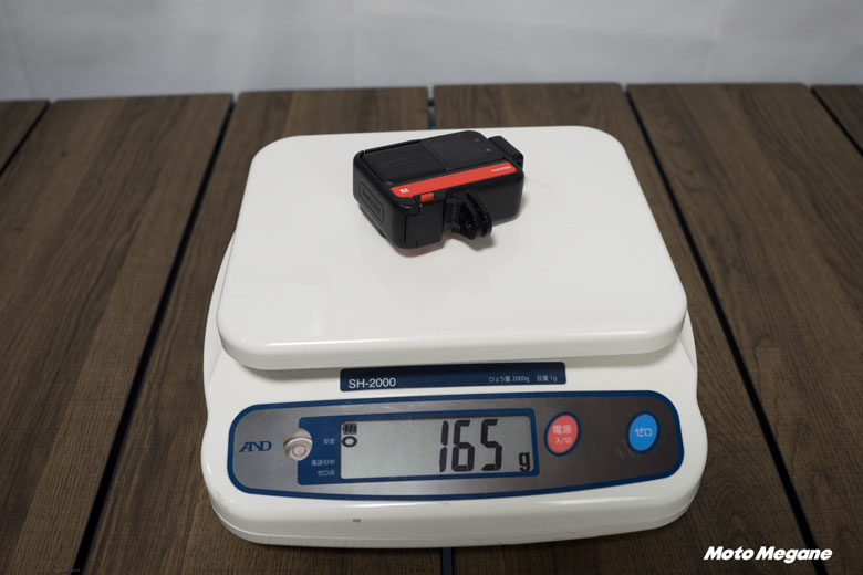この状態でGo ProとInsta360 ONE RSの重さを比較してみるとInsta360 ONE RSが165g。Go Pro+外部マイクアダプタ+アダプターを収納するためのブラケットで217g。もう少しスマートに使うためのメディアモジュラーとのセットだと203gです。