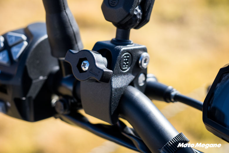 ファットバーのKTM 390 DUKEにマウントしましたが、グリップ付近は22.2φ。バイクアクセサリーバンドル付属のヘビーデューティークローマウントは17~30φまでに対応しています。
