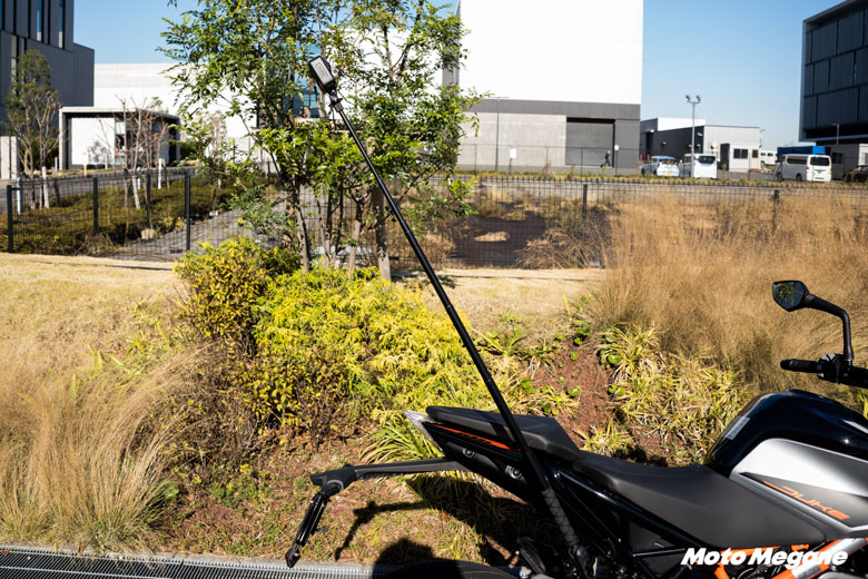 ただスマホのアプリで画角をチェックしていると、どうしても70cmよりも高い画角で撮影してみたくなります。その場合にはモーターサイクルU字ボルトマウントと120cm見えない自撮り棒の組み合わせで対応可能です。