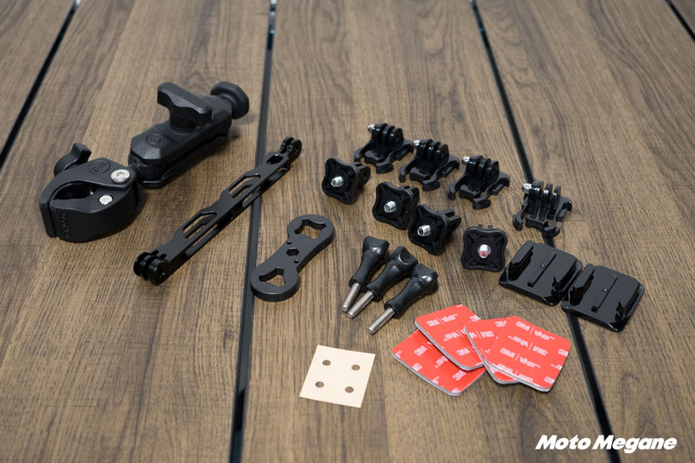 バイクに装着する際には専用のバイクアクセサリーバンドルが用意されています。ヘルメットやタンク上、テールカウルの上側へのマウント、ハンドルやミラーのシャフト部分に装着する為のヘビーデューティークローマウントなどがセットになっています。