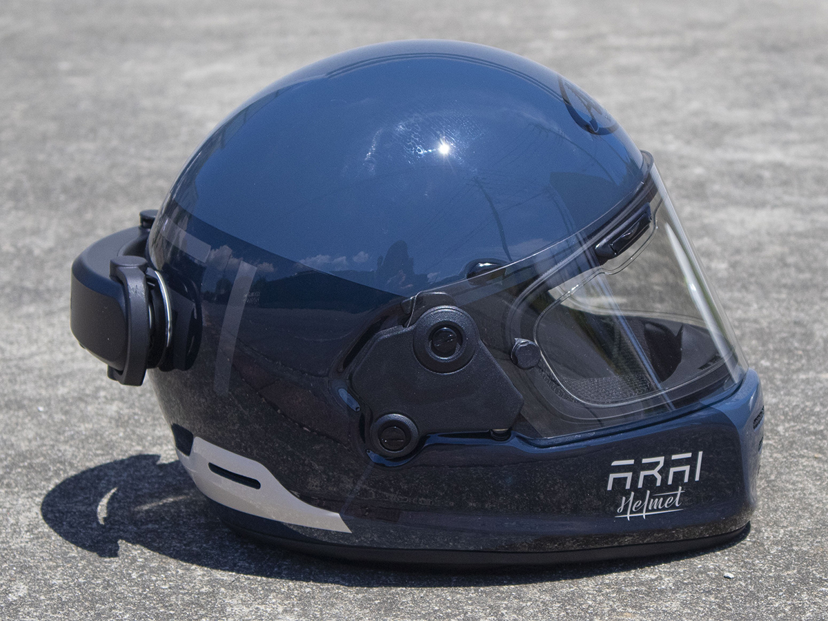 フルフェイスヘルメットも、ヘルメットの暗いブルーと、addSoundのブラックがうまく馴染んで、なかなかのフィット感です。でも取り付け位置をもう少し下げても良かったかも?ベストな位置を探るのが意外とむずかしかったです。