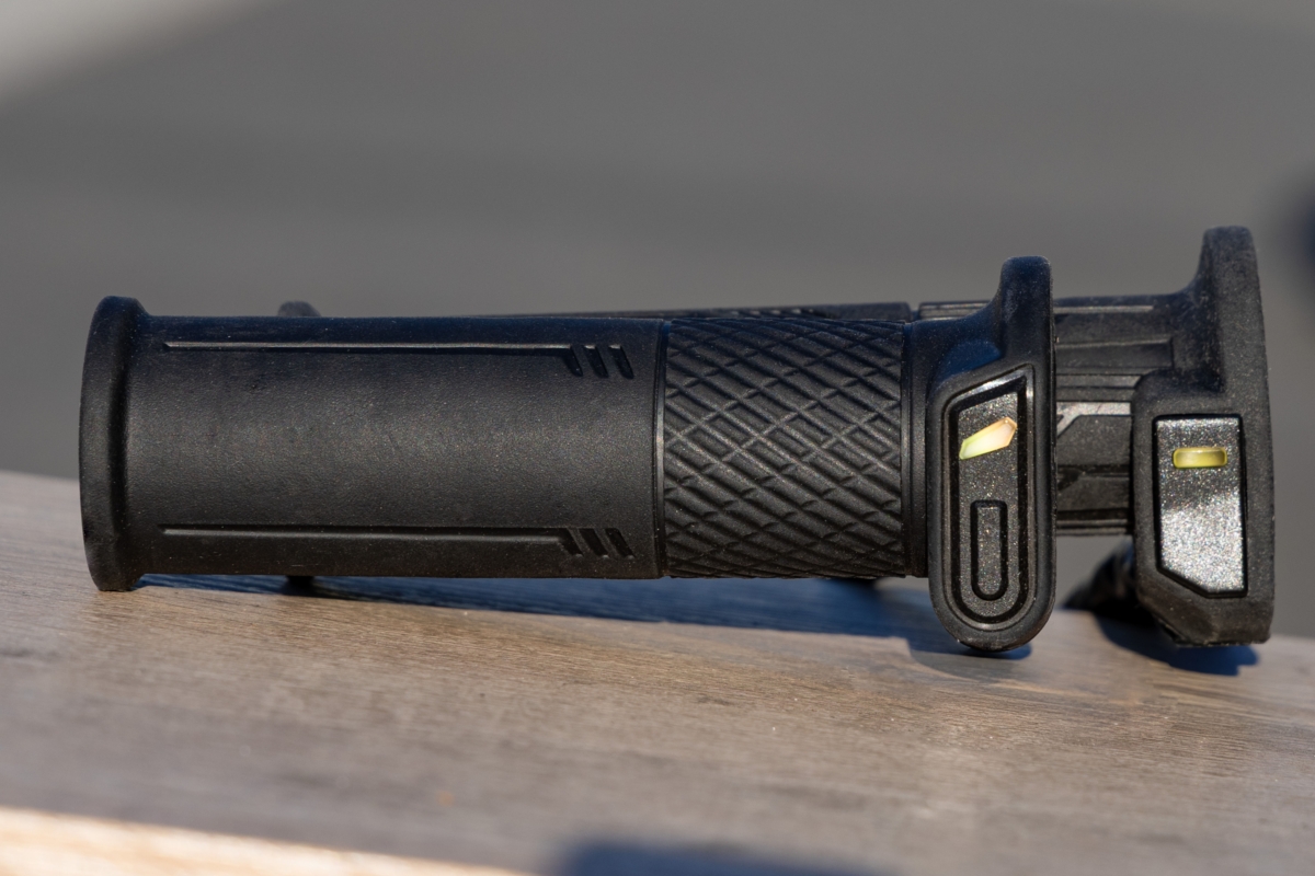ニューモデル「GH11」の電源ON/OFFと5段階の温度調節を兼ねるスイッチボタンを、従来モデル「GH10」よりも小型スリム化することに成功。ハンドルまわりがスッキリ見える車体と一体感のあるデザインは、バイクのスイッチボックスに隣接して位置しウインカーやホーンの操作性を損なわない。心地よいクリック感があり、誤作動のリスクを軽減する