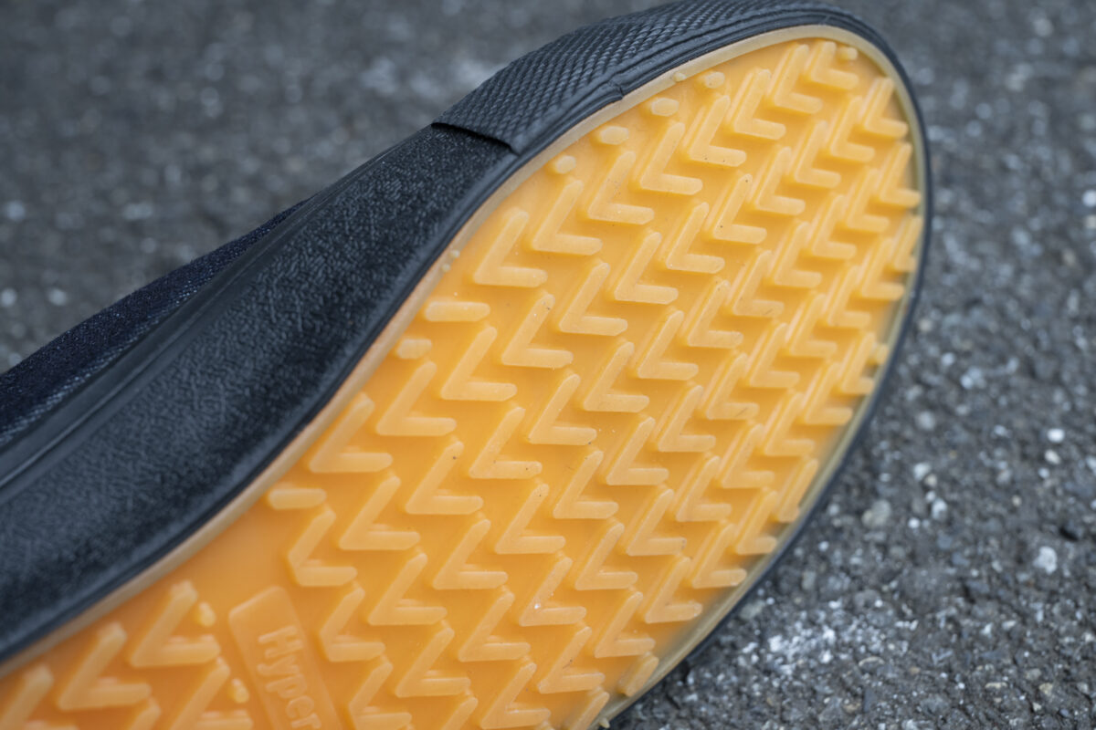 「ハイパー V®︎ デニム スニーカー」の最大の特徴のひとつがソール。「雨の日でも安心して履ける1足を」そんなコンセプトで制作されたスニーカーは、岡山県の日進ゴム株式会社と共同開発したものです。創業100年を数える同社は、建築現場などで使用される地下足袋を長年販売してきました。建築現場の職人たちが愛用する地下足袋は、ソールにゴムを使用しており、この「ハイパー V®︎ デニム スニーカー」でも現場仕事で職人たちから絶大な支持を得てきた極めてグリップ力の高いソールを搭載しています。