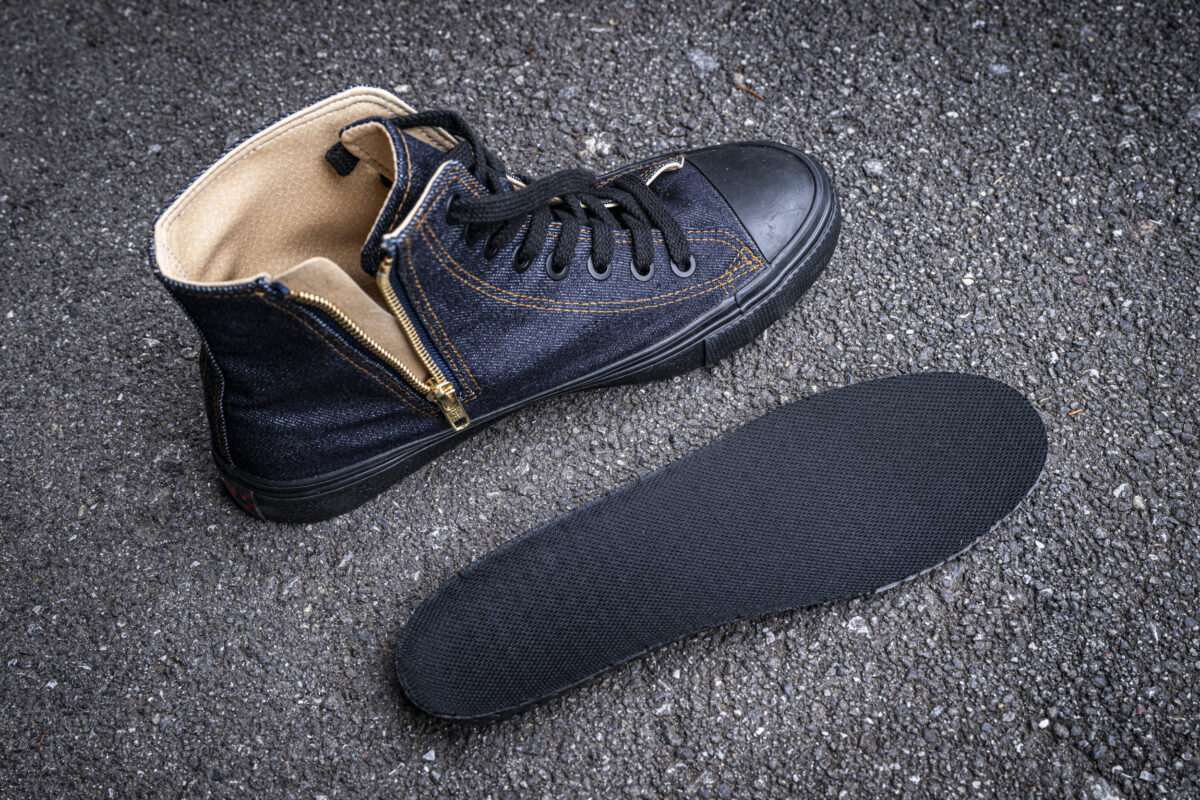 スニーカー本体の素材は児島ジーンズお馴染みのデニムです。ジーンズやジャケットなどと同様に、履いていくほどに足に馴染み、徐々に色落ちする経年変化が楽しめる作りです。