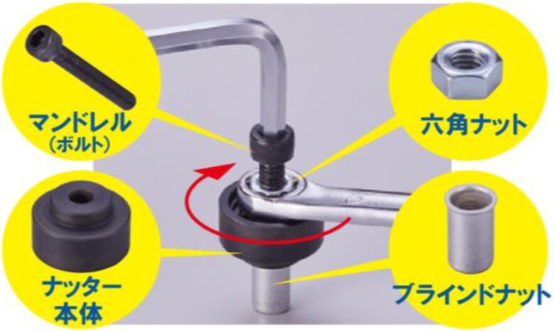 母材にネジ穴を生成することができるブラインドナットを、専用工具なしで取り付けることが可能な便利セット。従来品「ちょっとナッター」に比べて使用可能なナットの範囲が大幅に広がった。(アルミ製・ステンレス製・スモールフランジタイプ等)