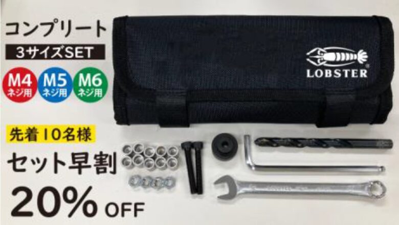 展開はM4、M5、M6の3サイズ、必要な工具とツールロールが付いたマクアケ限定セットとして販売する。各サイズのセットに加え、3サイズのコンプリートセットも用意されている。早期割引で最大20%OFFのチャンス。詳細はURLを参照しよう。