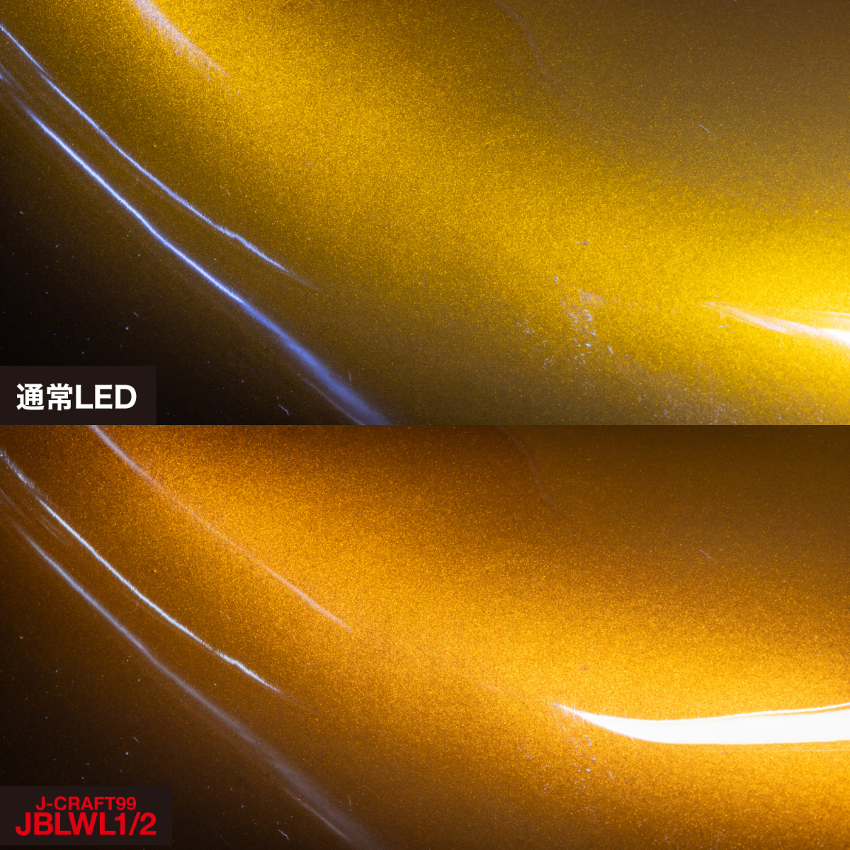 このキャンディペイントに通常のLEDライトとRa値 97 以上を誇るJ-CRAFT99のLEDライトの光を当てて見比べてみた。すると、J-CRAFT99のLEDライトは、色味も非常に自然でカラークリアの下のシルバーラメの風合いまでよく視認できた。