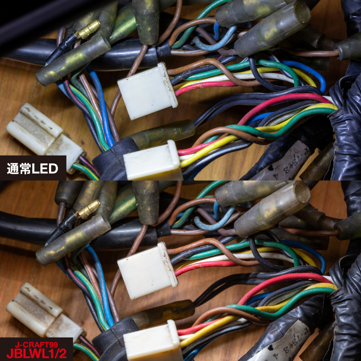 同じ配線の束をライトの光を変えてそれぞれ撮影してみると、その違いが理解できた。高演色LEDライトの方が発色が自然で、配線が見分けやすいのが明らか。一方の一般的なLEDの方は白と黄色が見分けづらかったり、緑や赤の発色が悪いのがわかる。肉眼でも同じような印象だった。