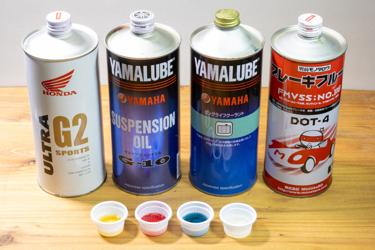 写真右からブレーキフルード、冷却水、フォークオイル、エンジンオイルの順。