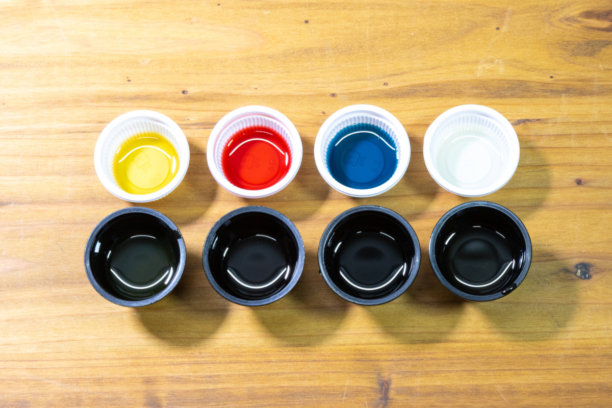 そこで、黒いカップに入れてみると全く判別できなくなった。黒エンジンに付着した液体はすべて同じ色に見えるのと同じ状態だ。
