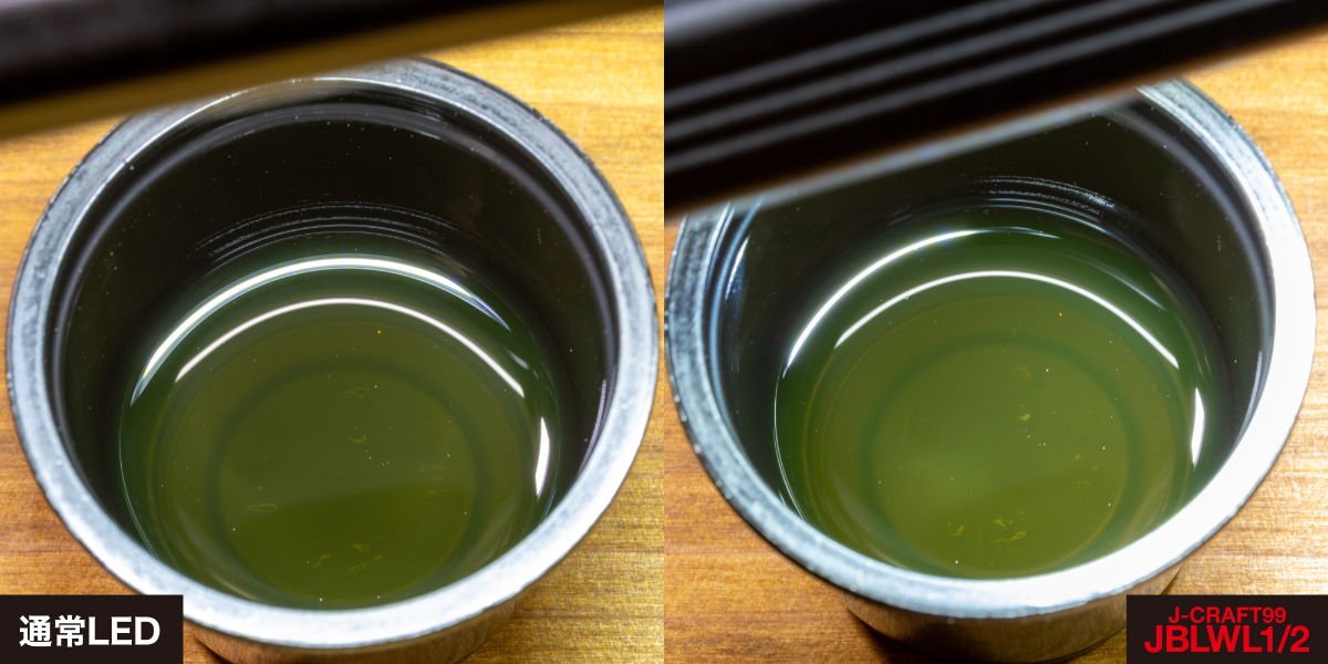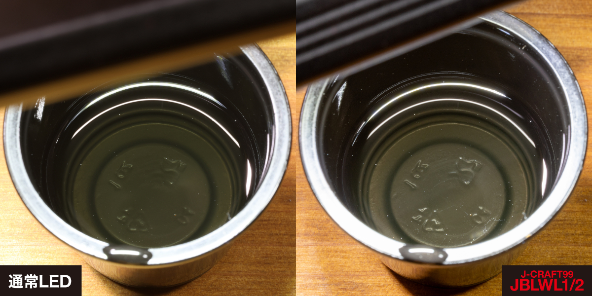 希釈使用するタイプの原液だったためかなり色が濃く、J-CRAFT99の高演色LEDライトで照らすとなんとか青色が判別できた。一方、普通のLEDライトで照らしたところ、色はほぼわからない。これも明確な差が確認できた。