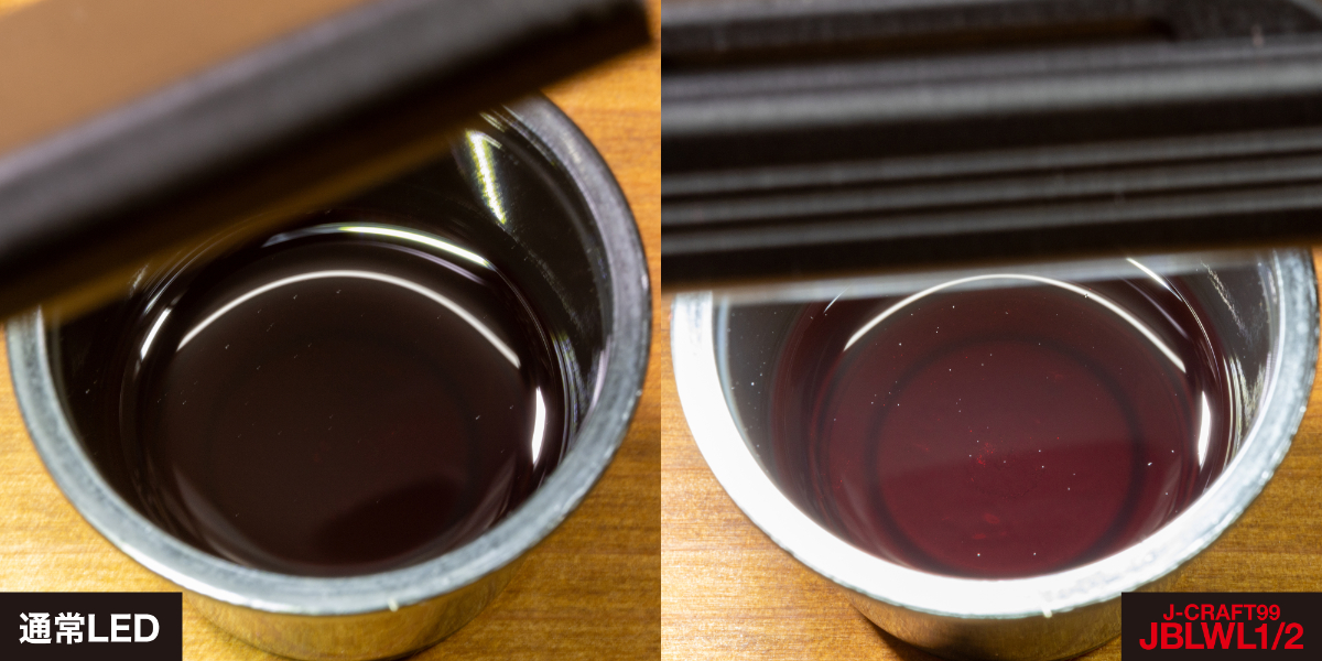 J-CRAFT99の高演色LEDライトならば、赤い色がしっかり判別できたが、一般的なLEDライトではかろうじて赤色が分かる程度。見え方に明確な違いが出た。