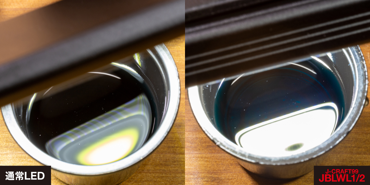 通常のLED作業灯と並べてその光を写真に収めてみると色味の違いがよく分かる。写真右がJ-CRAFT99の高演色LEDライト。