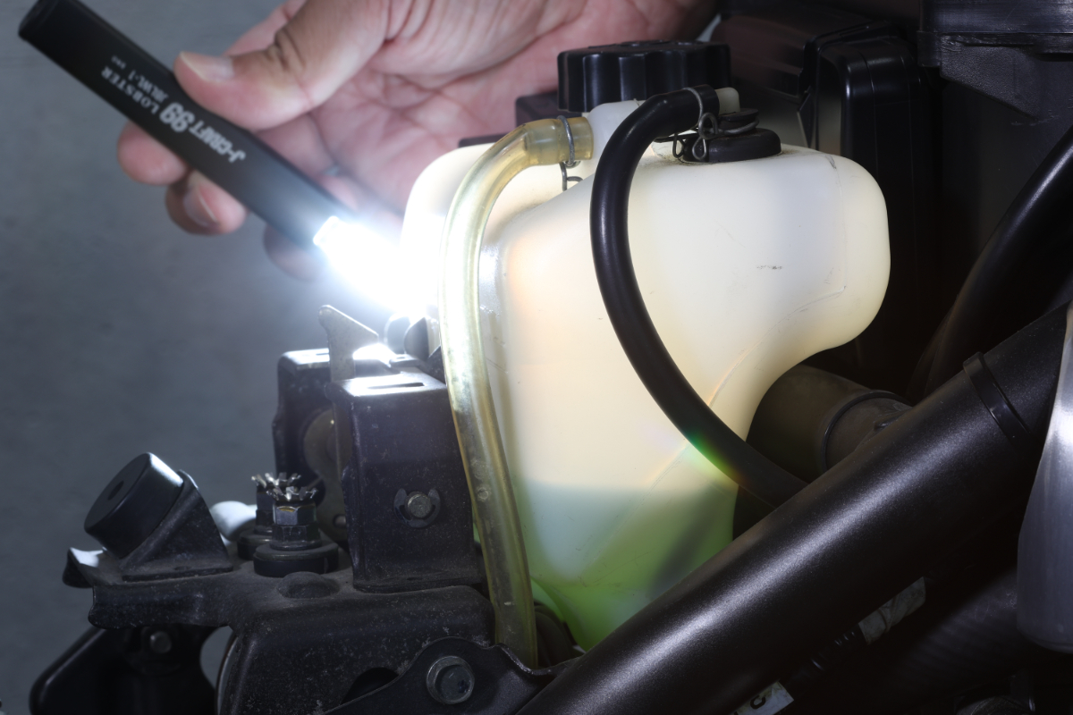 困るのは、駐車したバイクの下に液体の染みを発見した時だ。どんな液体がどこから漏れているかを正確に特定するのが的確な修理を行う鍵となる。白いウエスに染み込ませたり、匂いでの特定も可能だが、目視確認ができれば修理診断の補強材料にもなるし、時間も設備もないツーリング先の夜間などでは、ライトだけが頼りになる場面もある。