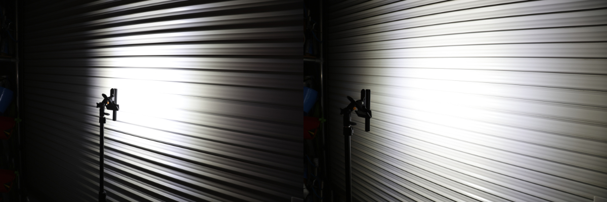 シャッターから20cm(左)と50cm(右)離した際の照射範囲。JBLWL1と同じく広範囲に照らすことができる。