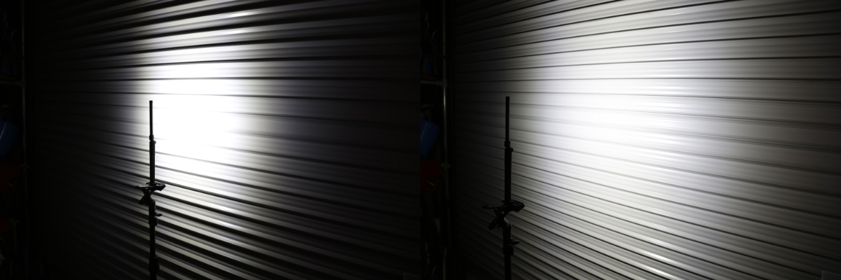 シャッターから20cm(左)と50cm(右)離した際の照射範囲。直進性の高いLEDだが、広範囲に照らすことができている。