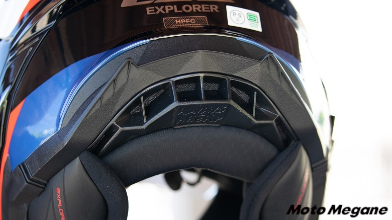 排気ポートは後頭部と側面の左右2ヶ所ずつにスライドシャッターを装備。下部の首元には常にオープン状態の排気ポートがあり、ヘルメット内の蒸れを抑制して快適な被り心地をアシストしてくれる。