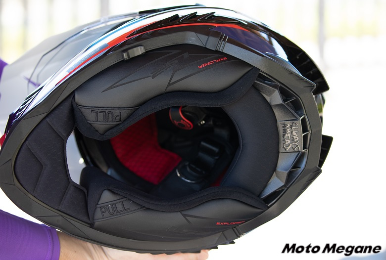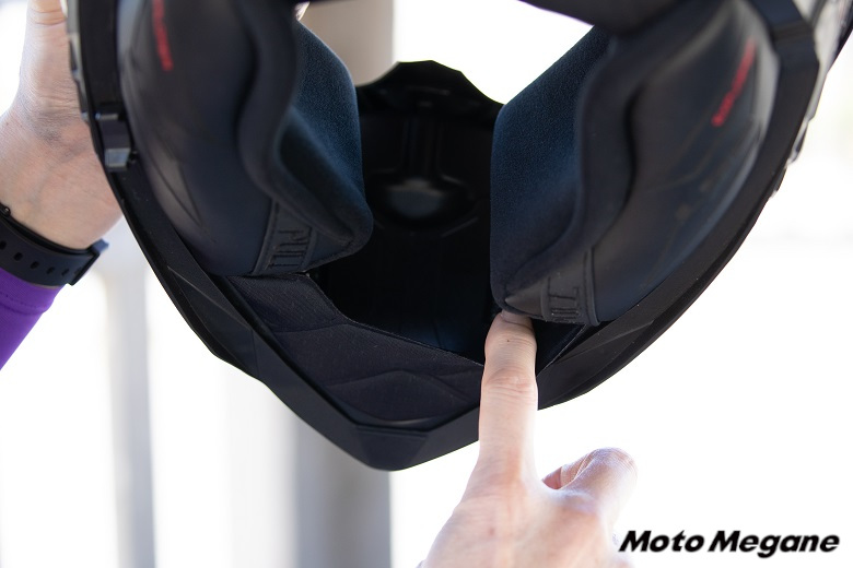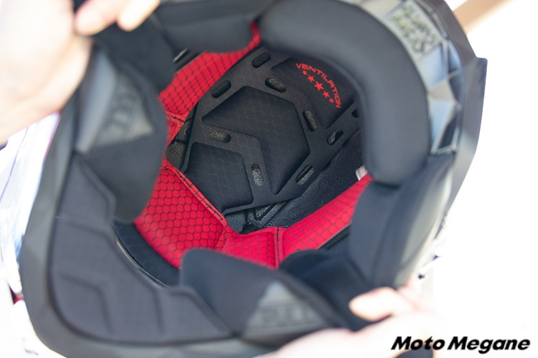 インナーにはハニカム状のパターンがプリントされており、肌触りはサラサラした感じで吸湿性にも優れ、汗をかいてもベタつきにくい。チークパッドはソフトながらも密着性が高いので、ラフなフィールドを走っても慣性により前後左右に揺られることが少なく、スポーティかつ安全なライディングを追求できる。