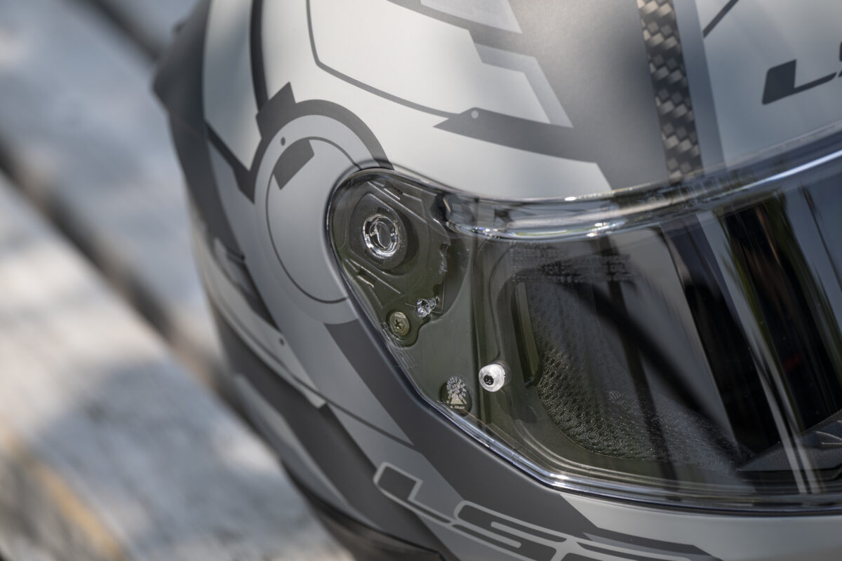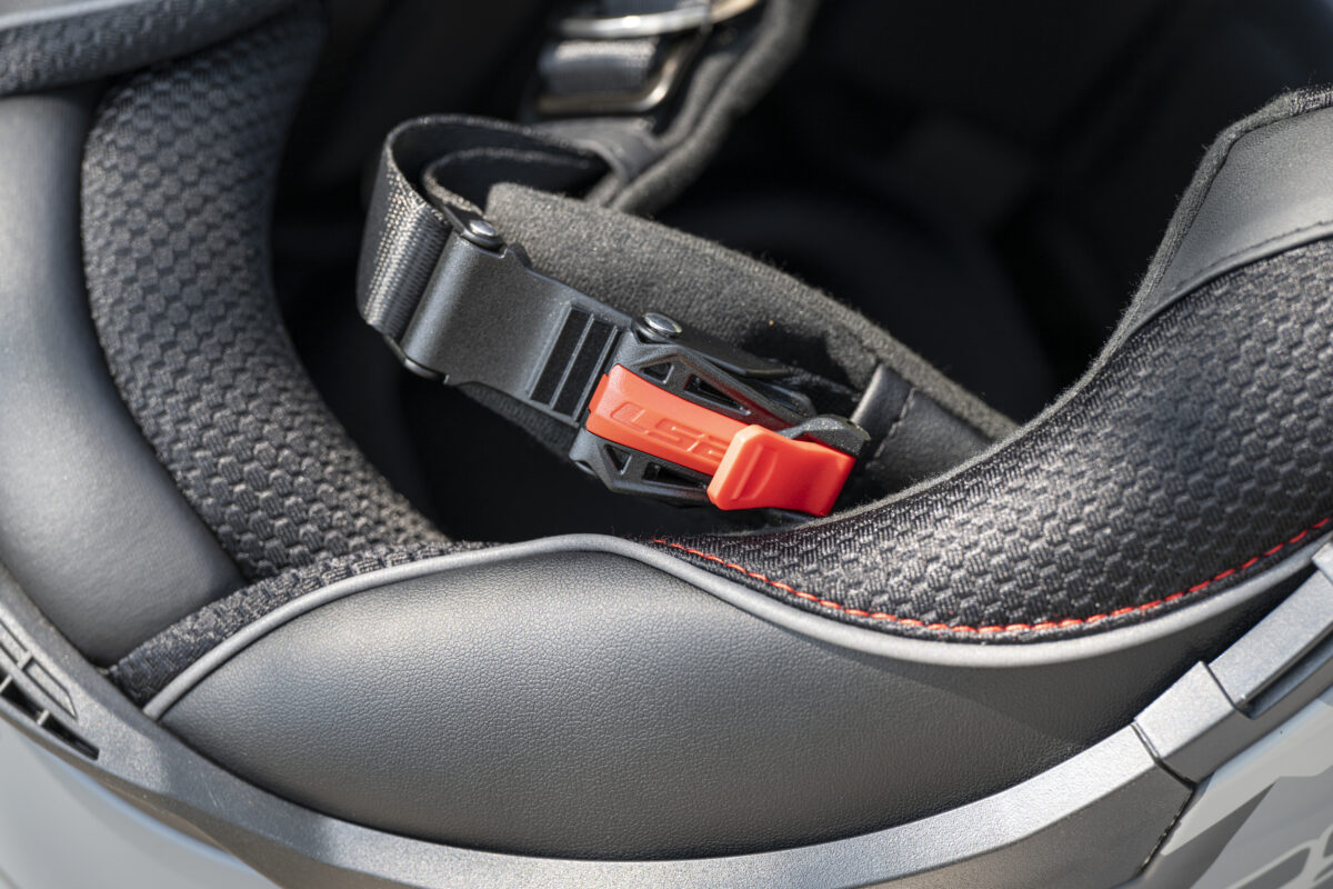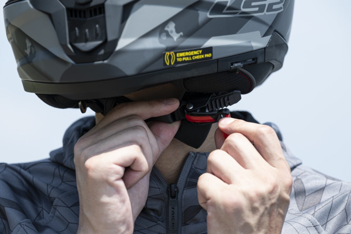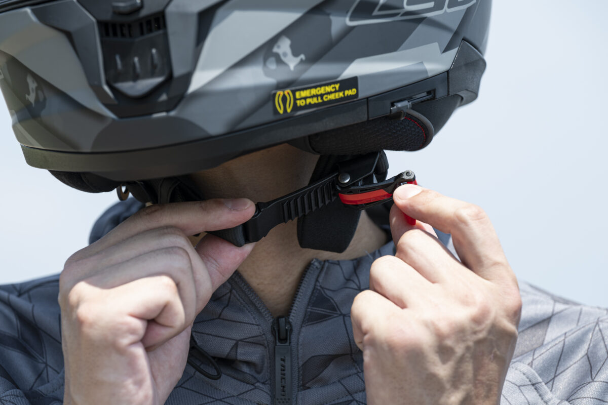 あごのストラップは、簡単な開閉を実現しながら高いロック性を誇るLS2独自のラチェットシステムを採用。フィット感の調整も簡単です。
