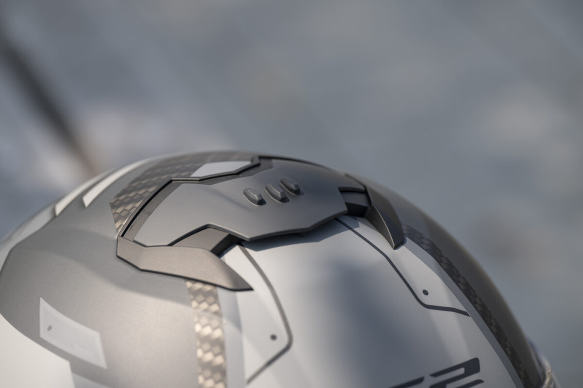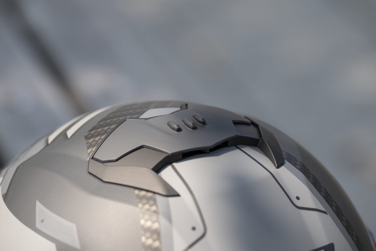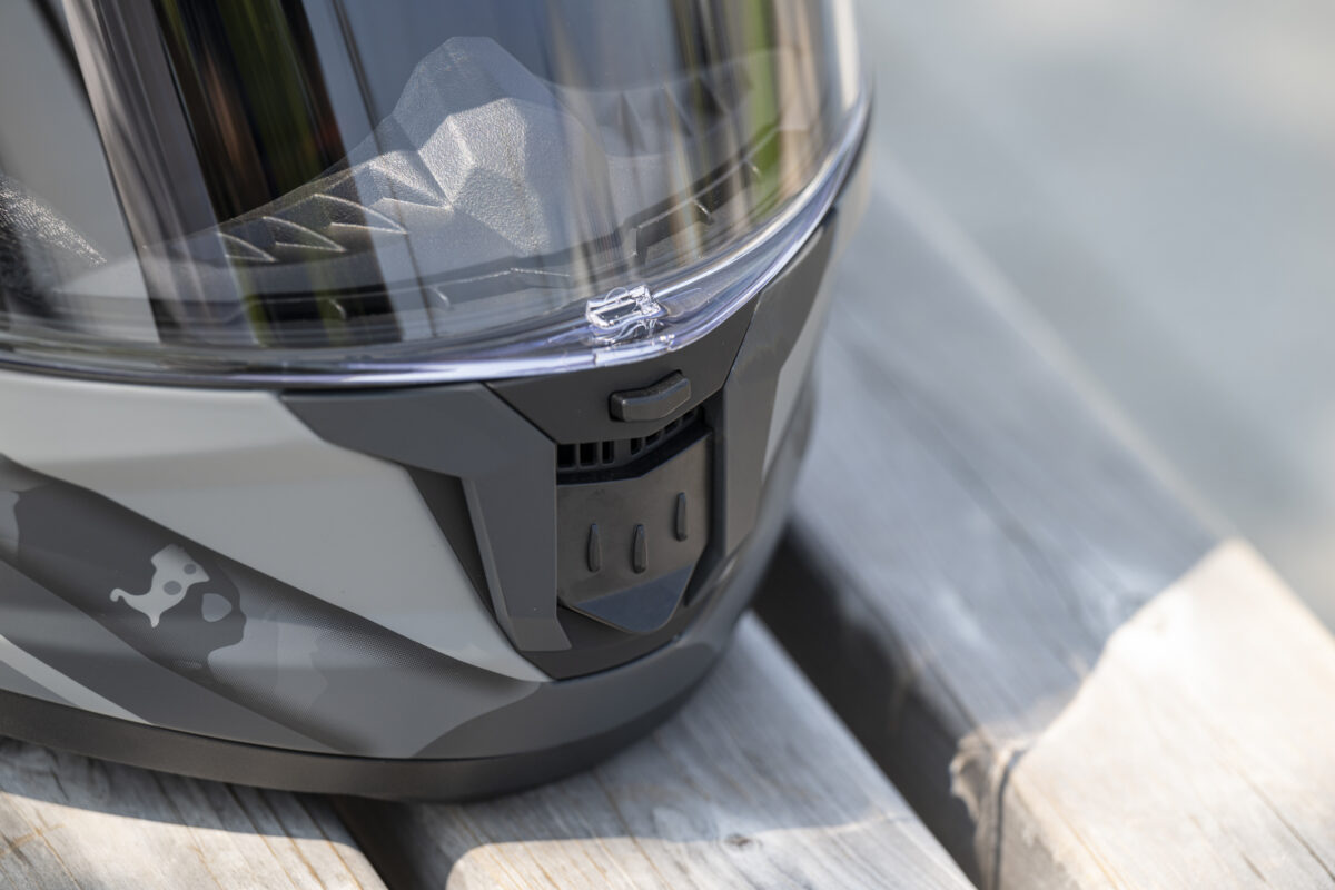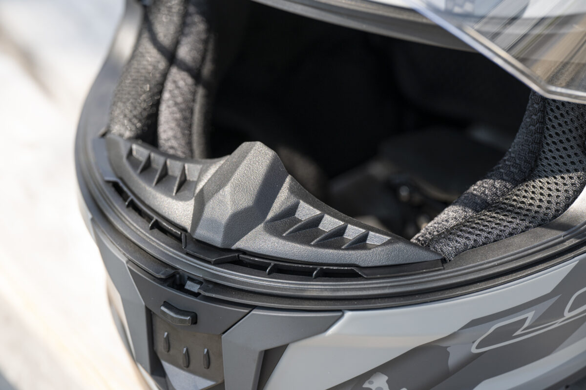 またヘルメットの開口部でも快適性を高めるべく、空気の流れを整える細かなパーツを装備。鼻先には小型のディフューザーを設けており、冬場や雨の日に鼻息や吐息が直接スクリーンに届かないように配慮されています。またチンガードのベンチレーションから入った走行風の一部はシールド裏側にも循環する作りで、シールドの曇りを防ぐほか、顔全体にフレッシュエアを導く構造になっています。