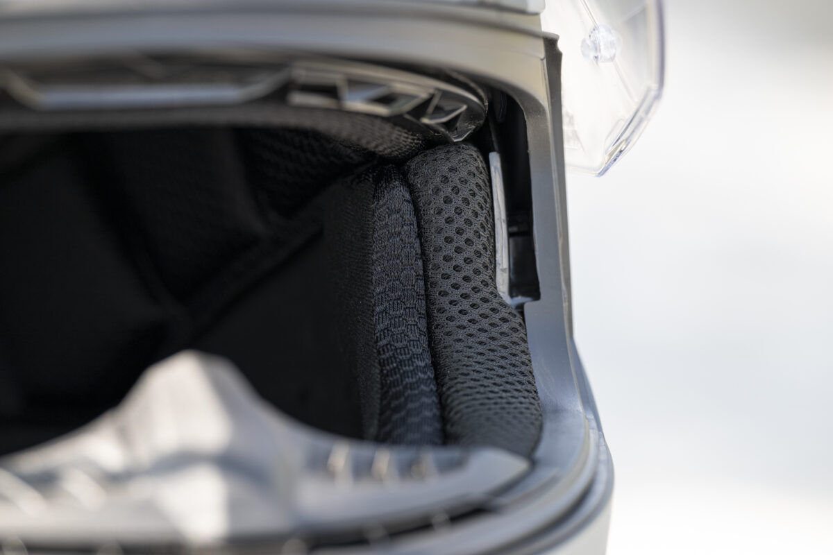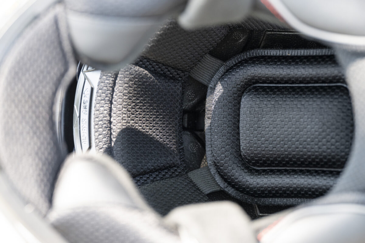 特に肌に直接触れる部分のナイロンは、網目も細かくやさしい肌あたりが特徴です。チークパッドの圧迫も少なく、顔が大きく潰れないのも快適性を高めています。また、頭頂部は釣り天井式のような構造で被った時に頭頂部を優しく包み込むような感触で圧迫感もありません。こうした内装の仕様は世界共通ですが、前述したようにジャパンフィットモデルでは、チークパッドから頭頂部周囲のサイズ、形状を日本人の骨格に合わせています。また、現代のライダーの必須アイテムであるインカムに対応すべく、従来よりもスピーカーホールを大型化、さまざまなタイプを収納しやすくしているのもポイントのひとつです。
