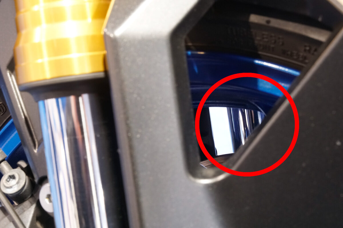フロントフォークの見える部分はキレイに磨かれていることが多いが、隙間から覗き込んでインナーチューブの裏側にサビや傷が入っていないかチェックしよう。