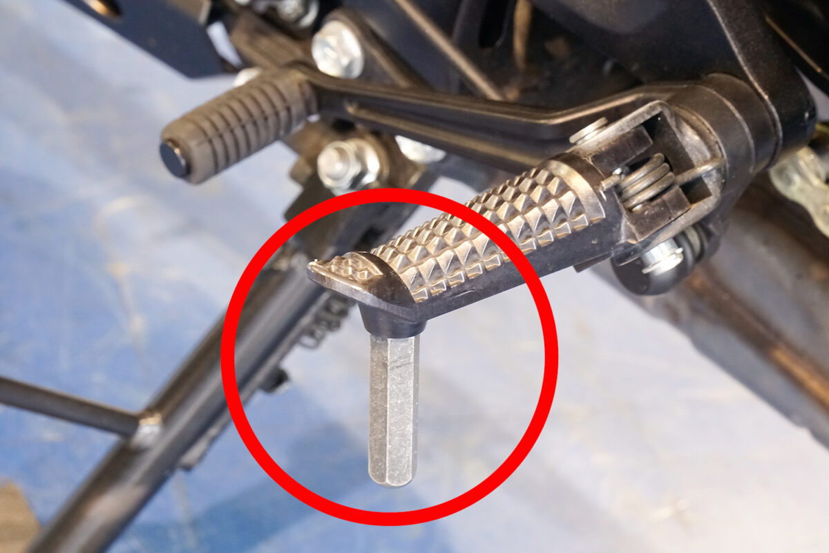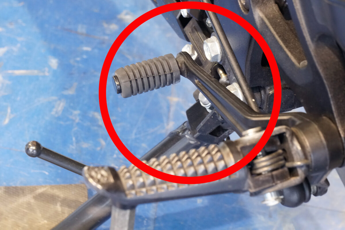 転倒時に左サイドにあるシフトペダルや右サイドにあるブレーキペダルが曲がったり、内側にめり込んだりしてしまうことがある。微妙な歪みがあった場合、曲がったりめり込んだりするレベルの転倒があった車両の可能性が高い。