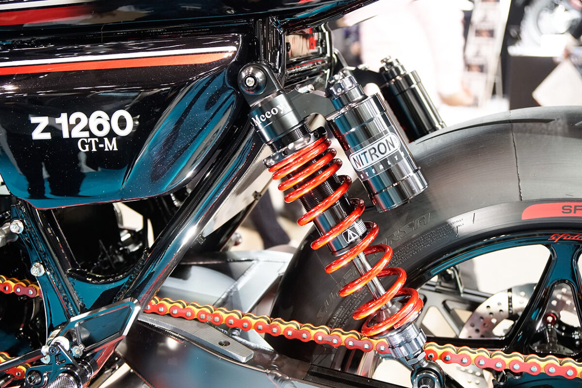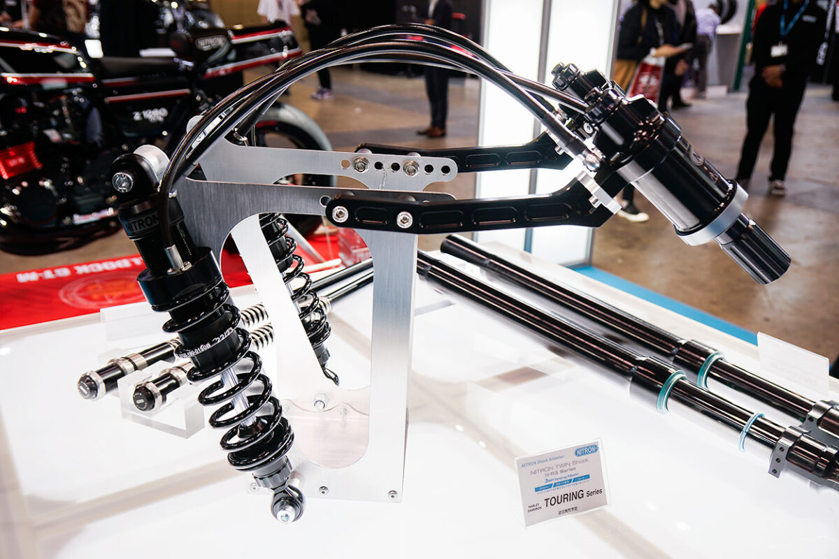 そんなナイトロンブースでは、近日発売予定のハーレーダビッドソン向けの新シリーズを中心に、ナイトロン公認のカスタムショックを取り扱うコンストラクターが手掛けたカスタム車両が展示されていた。