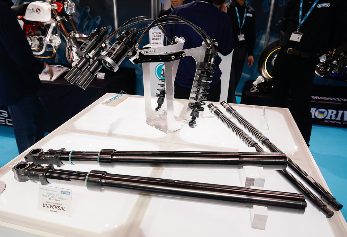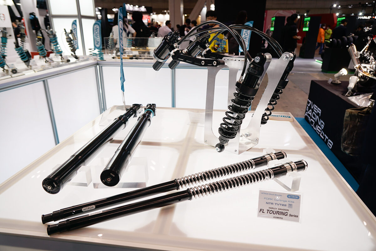 ブース中央に鎮座するハーレーダビッドソン用新作サスペンションたち。展示されたのは近日発売予定のナイトロン初となる倒立フォークにフォークカートリッジキット、そしてツインショック R3シリーズだ。