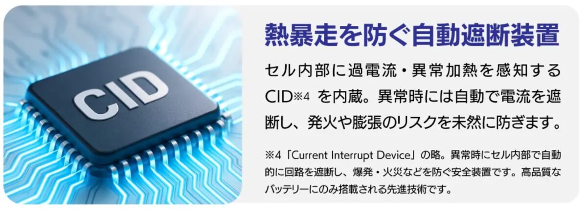 そのうえでOUTDOはCID(電流遮断機構)をセル内部に搭載し、