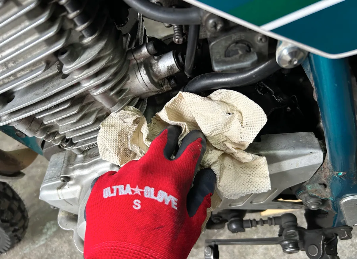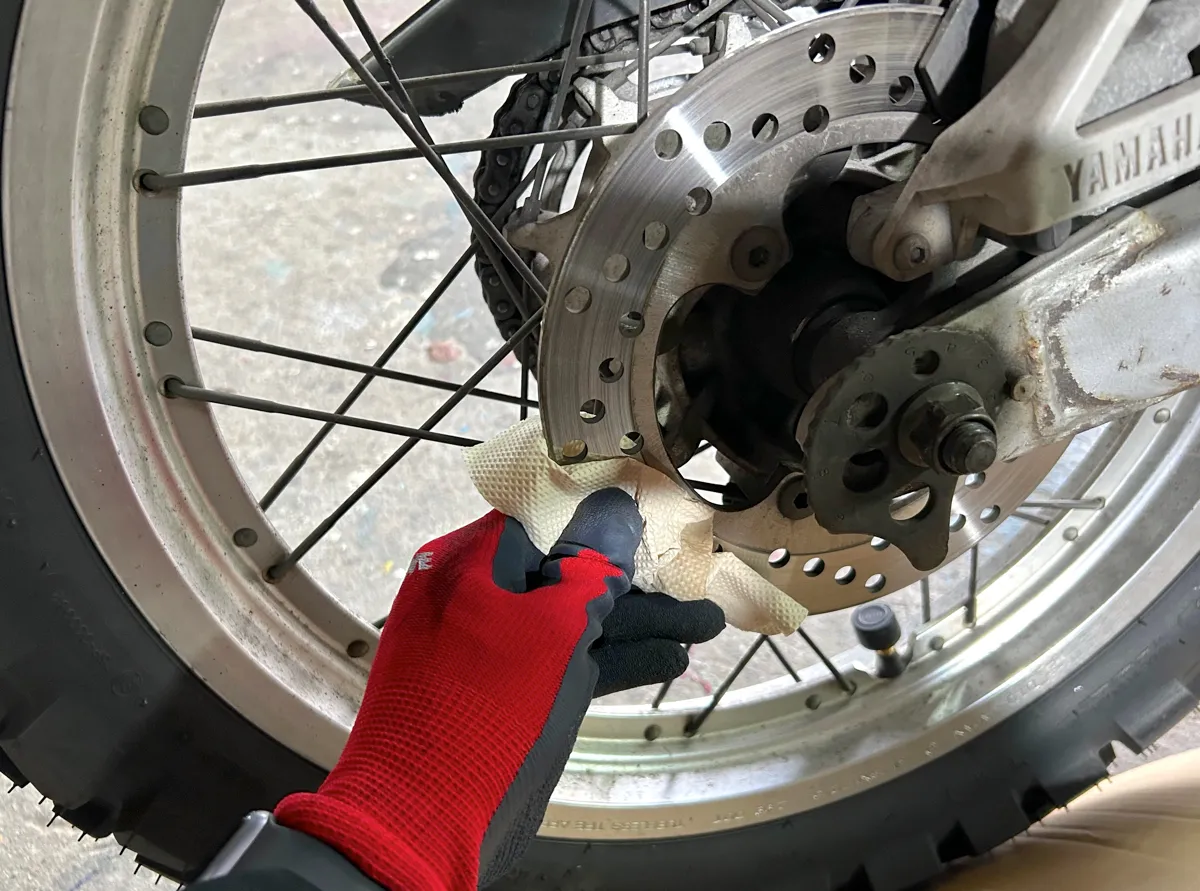 ちなみにこれは他社製品も含めての話ですが、ブレーキ&パーツクリーナーは脱脂効果が高いことから基本的にチェーンの洗浄はNGとなっているので…ここもブレーキディスク同様にチェーンにスプレーがかからないように、ウエスに吹いてから丁寧にフキフキします。