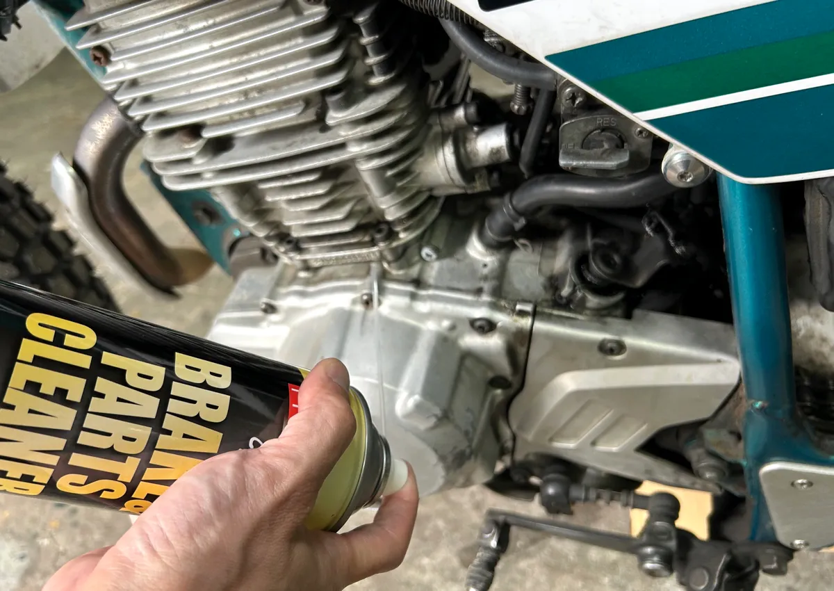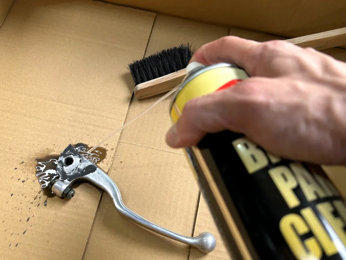 一般的に「ブレーキ&パーツクリーナー」ってのは主にバイクの金属部品やブレーキパーツ周辺に付着した油汚れやグリスなどの頑固な汚れを落とすための洗浄スプレーで、例えばバイク屋さんがオイル交換をする際に周辺にシュシュ〜っとふりかけているやつがまさにブレーキ&パーツクリーナーです。