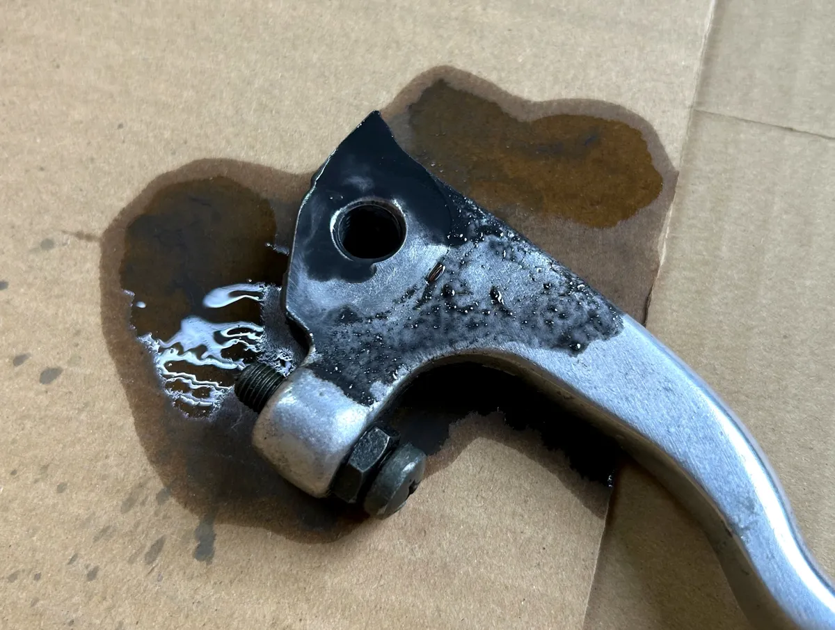 早速ブレーキレバーを取り外してみたところ、案の定得体の知れないドロドロかつギットギトのヤバそうな汚れが付着していたので…意を決して勢いよくプレミアムを噴射してみたところ…なんと!なななんと!まさかの速攻で汚れが吹っ飛んでいくではあ〜りませんか!?