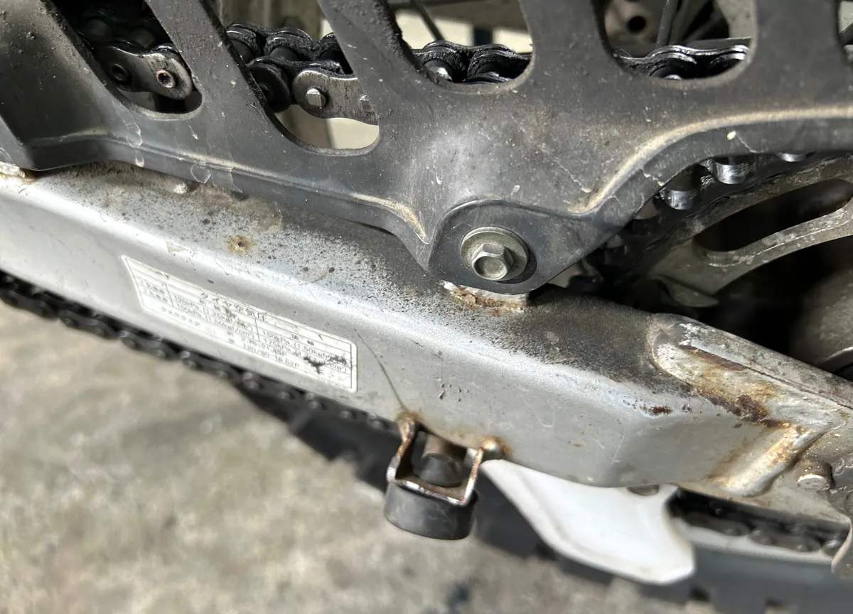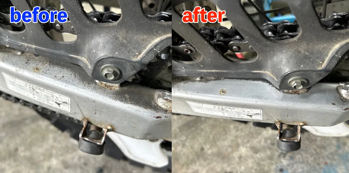 お次はもうちょっとベーシックの洗浄力を試したいので、頑固な汚れが目立つ場所の代表格「チェーン付近のスイングアーム」をキレイキレイしてみました!