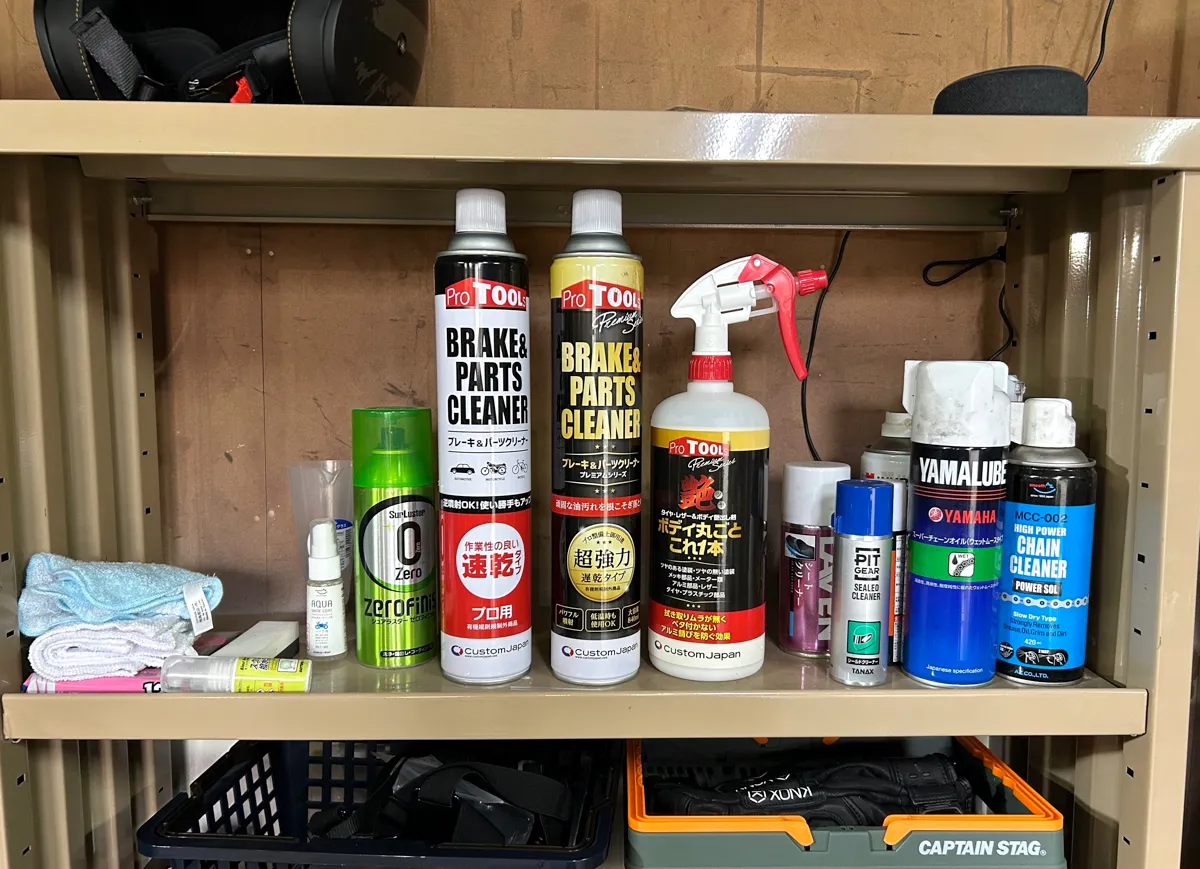 ブレーキ&パーツクリーナー:溶剤系なので水溶性で落ちない汚れに使う(エンジン周りなど)
