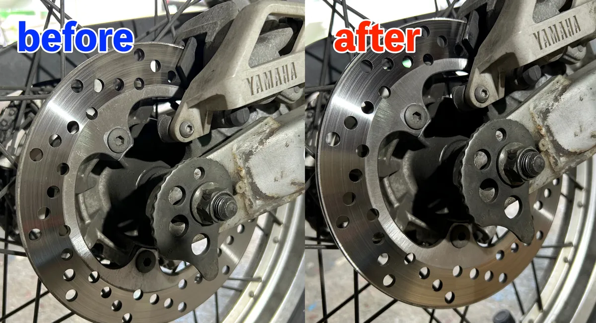 愛車が綺麗になると途端に「やめられない、とまらない、かっぱえびせんモード」に突入してしまう僕は…お次はせっかく「ブレーキ&パーツクリーナー」なのでブレーキのクリーニング、具体的にはセローちゃんのリアブレーキディスクをベーシックの方で洗浄してみました!