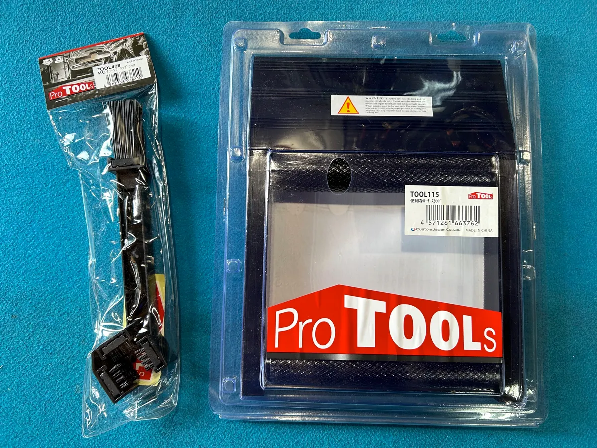 DA・KA・RA!チェーンに注油するならまずはクリーニングからスタートするわけですが、今回は同じくProTOOLsの「プレミアムシリーズ チェーンクリーナー・MCチェーンブラシ・便利なローラースタンド」の3点を使ってキレイキレイしたいと思います。