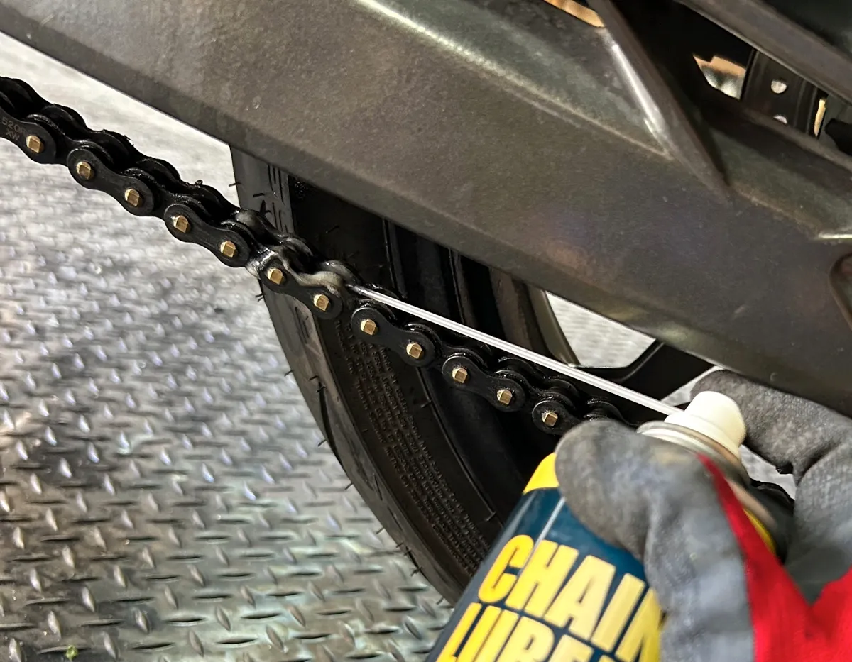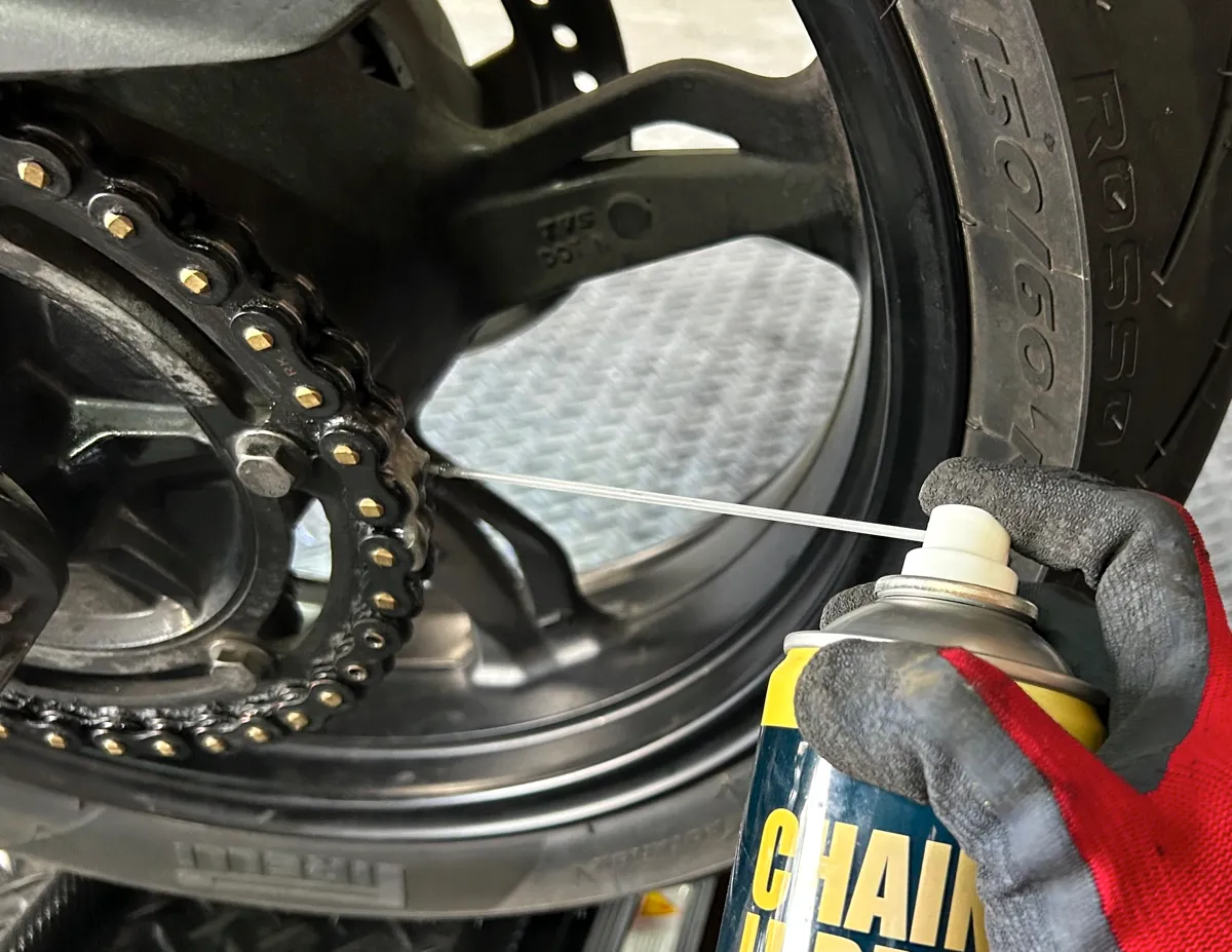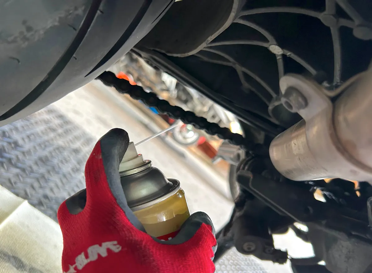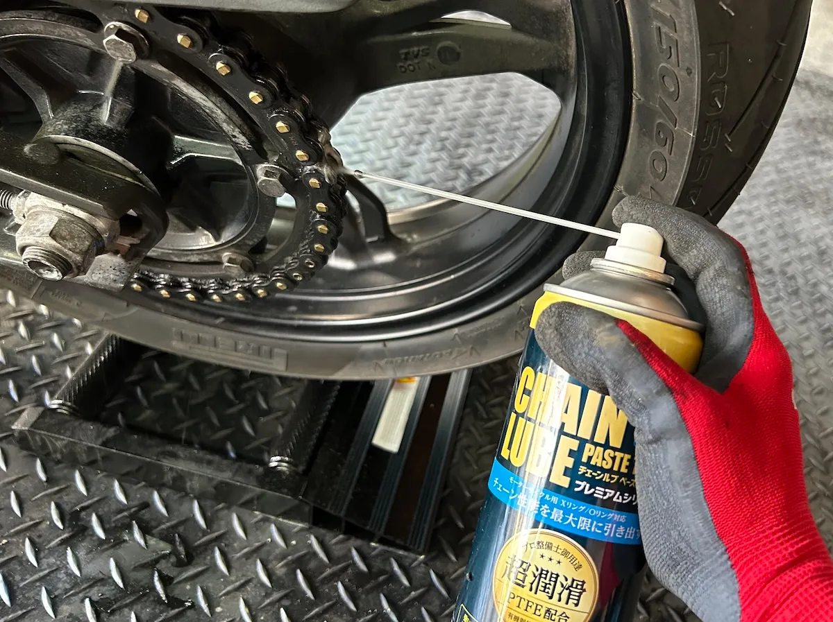 見事にキレイキレイになった奥様バイクのチェーンに、プロ仕様のチェーンルブを満遍なく吹きかけていきます!