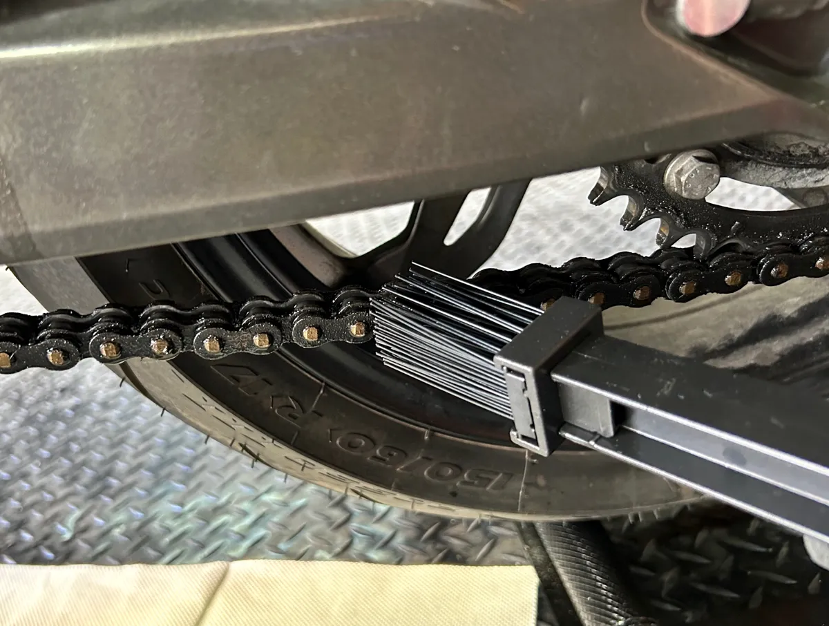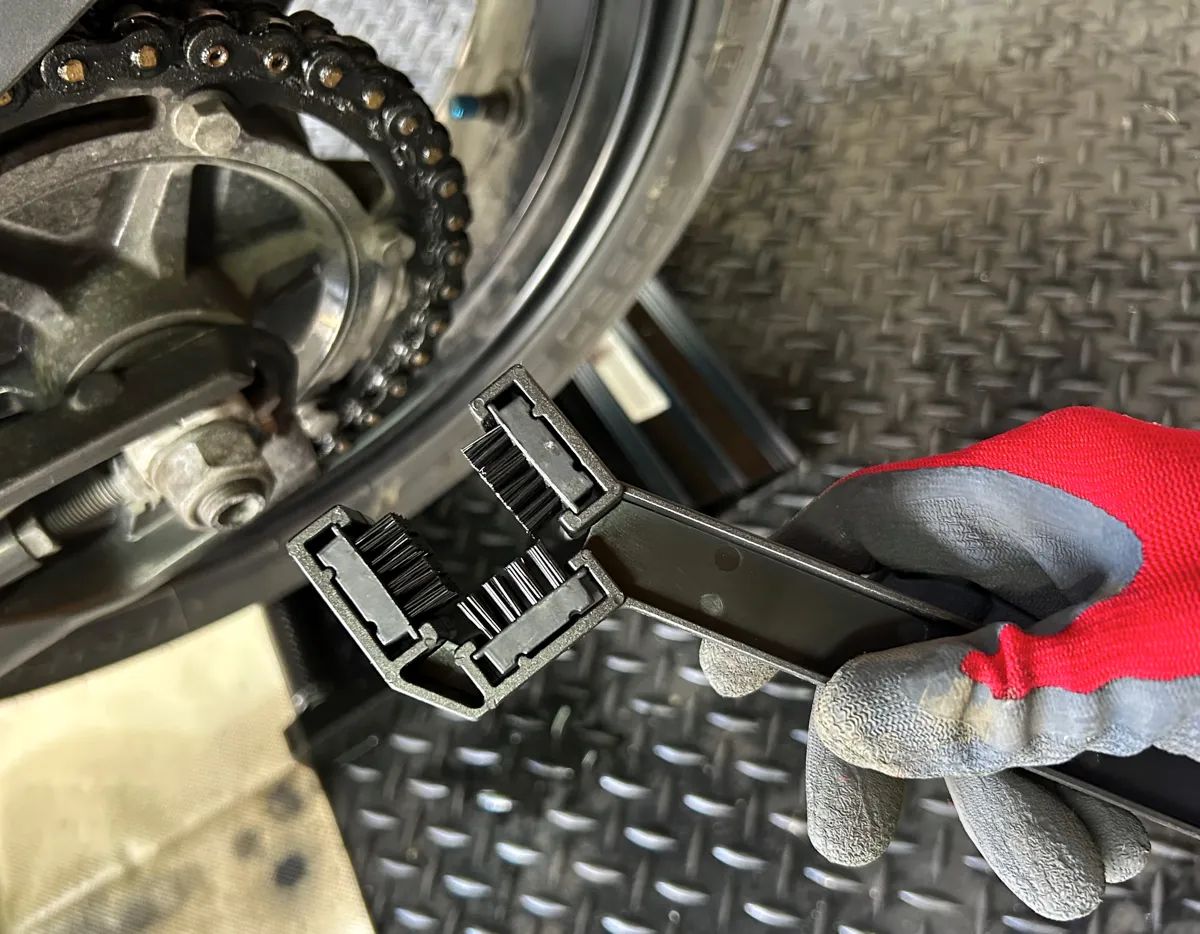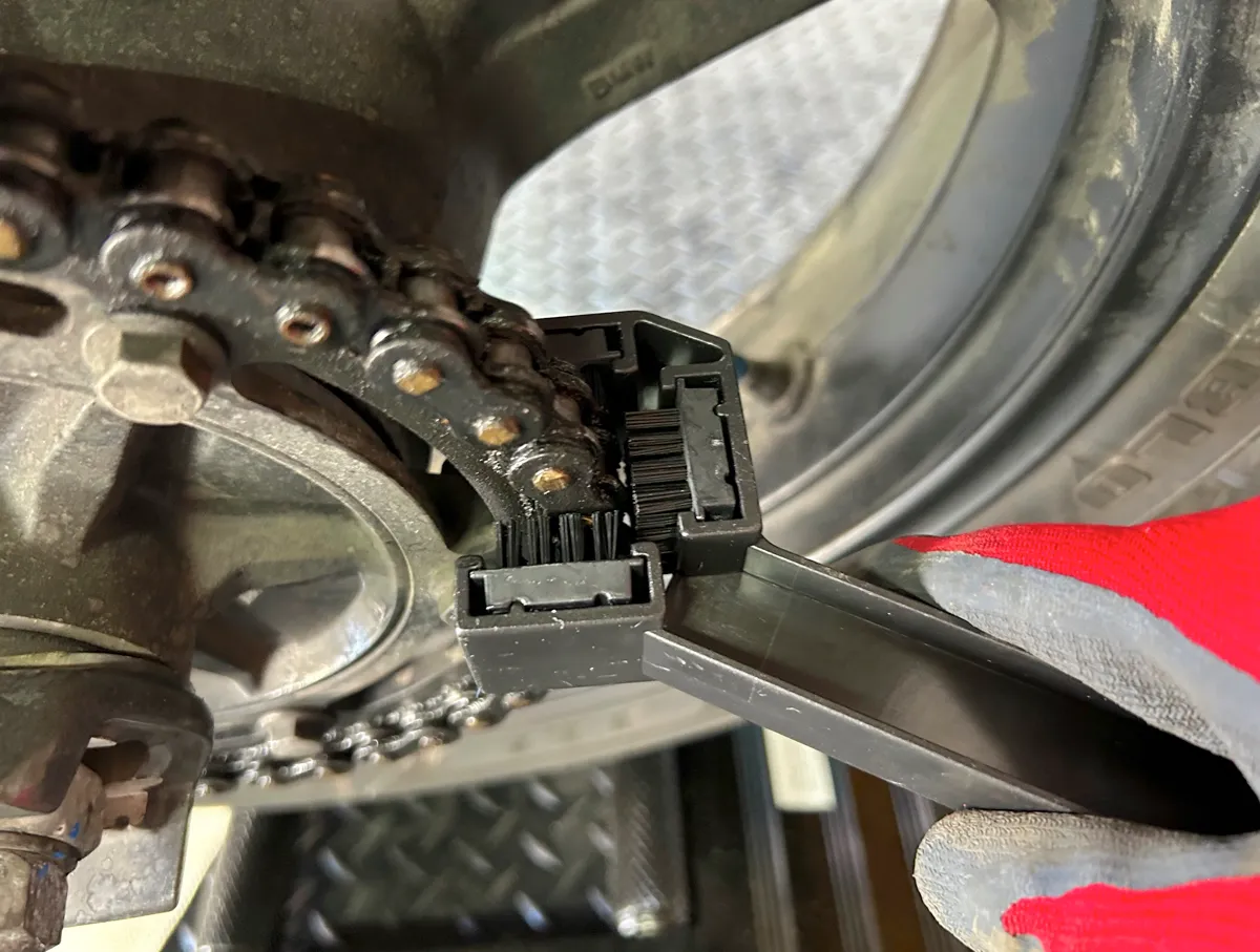 気を取り直してお次は「MCチェーンブラシ」で汚れが浮いたチェーンを磨いていきますが、これがチェーンにスポッとハマる3点ブラシ仕様なので、どうやっても汚れが落ちてしまいますし…反対側の1点ブラシでのピンポイントクリーニングも可能でございます。