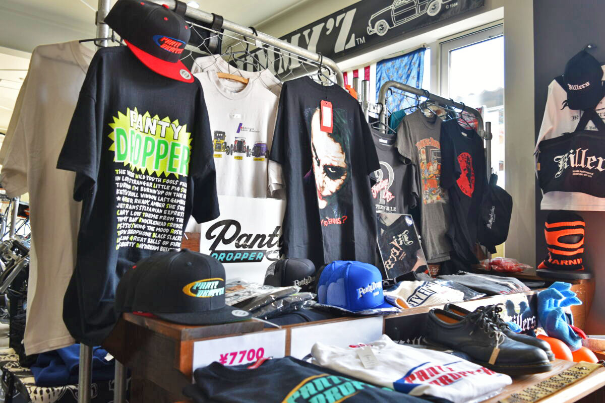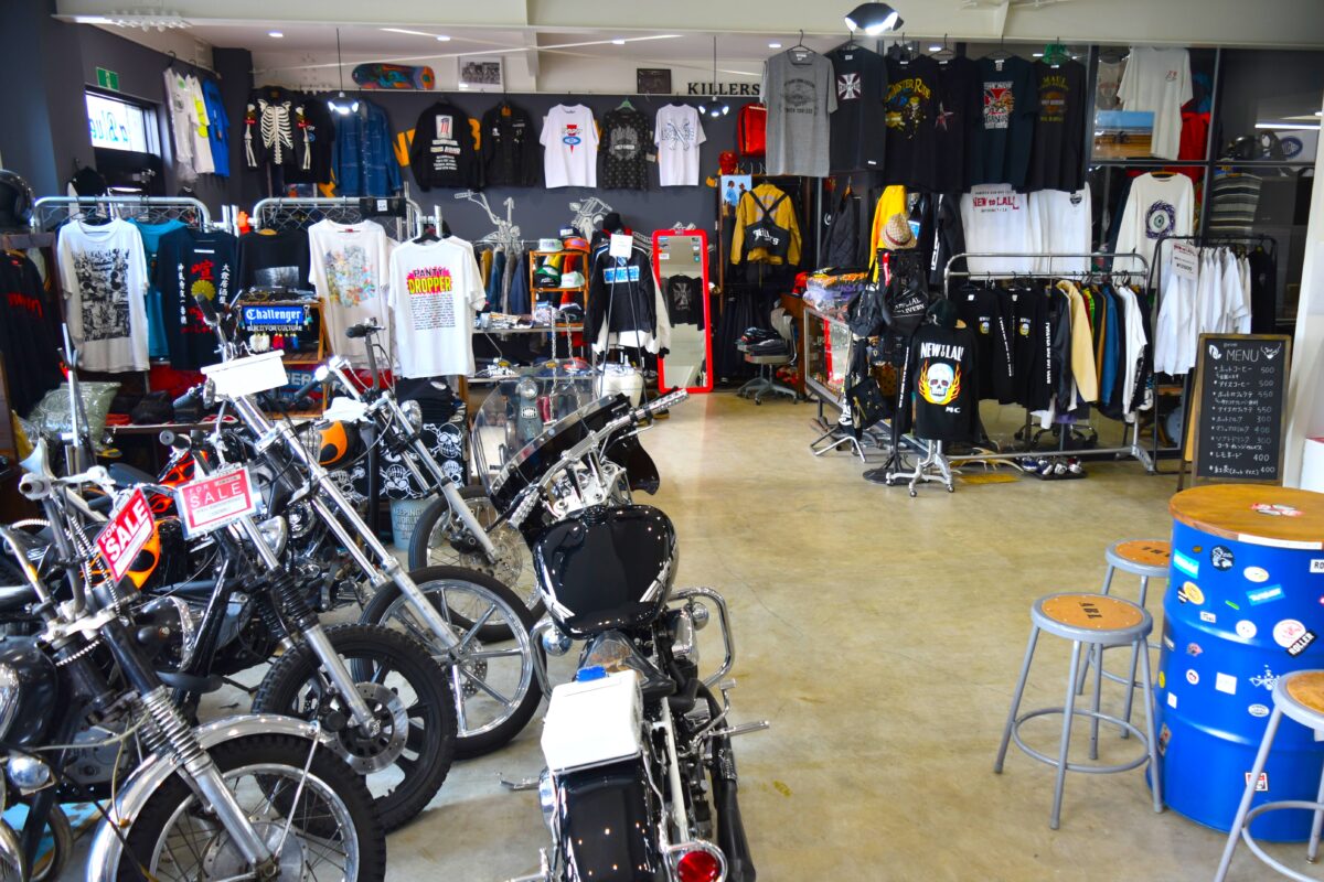 バイクに乗るならファッションにもこだわりたい。名古屋発祥の「ルースレス」や、東京発祥の「パンティドロッパー」、熊本発祥の「キングス」、そしてa Blue Leafオリジナルの「ニュートラルモーターサイクル」など、ライダーの心に刺さるアパレルを取り揃えています。ちなみにルースレスは「情け容赦ない」、パンティドロッパーは「女性自らが服を脱ぎたくなるほどの色男」という意味。ヤバさがクールです。